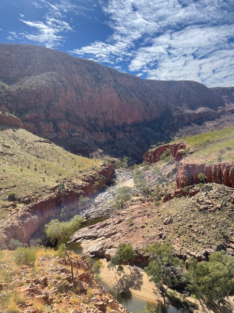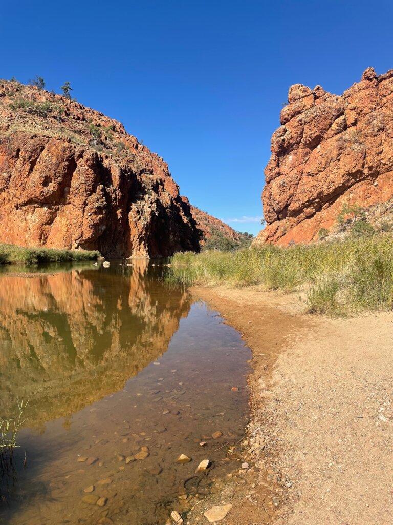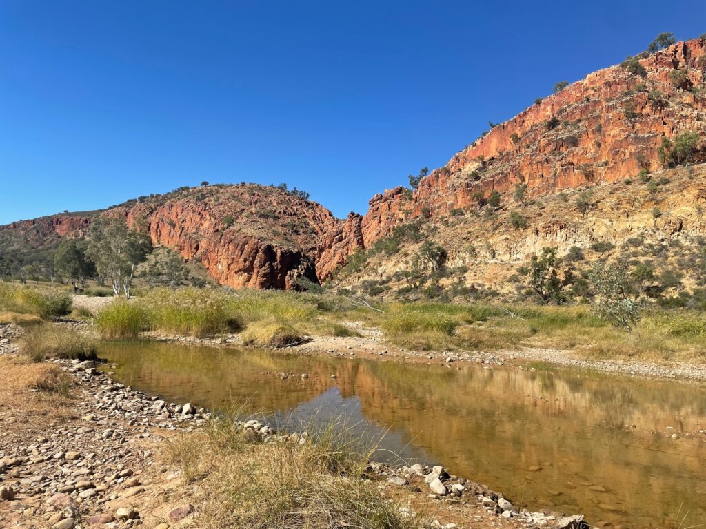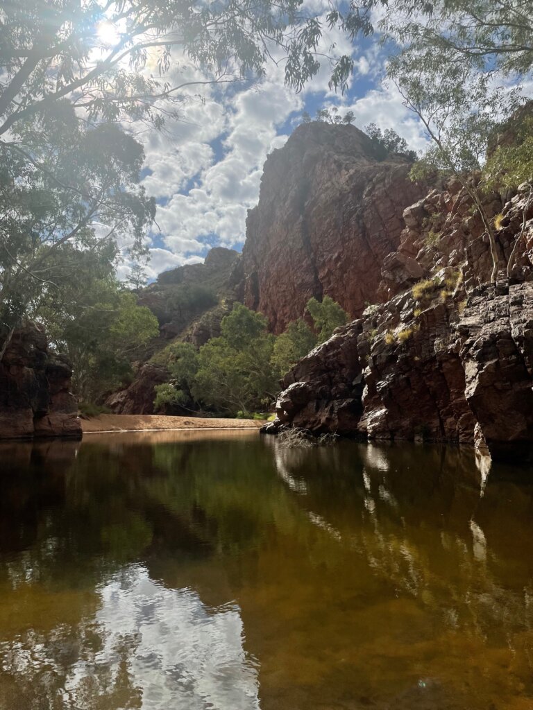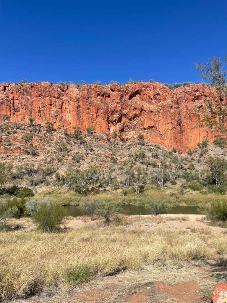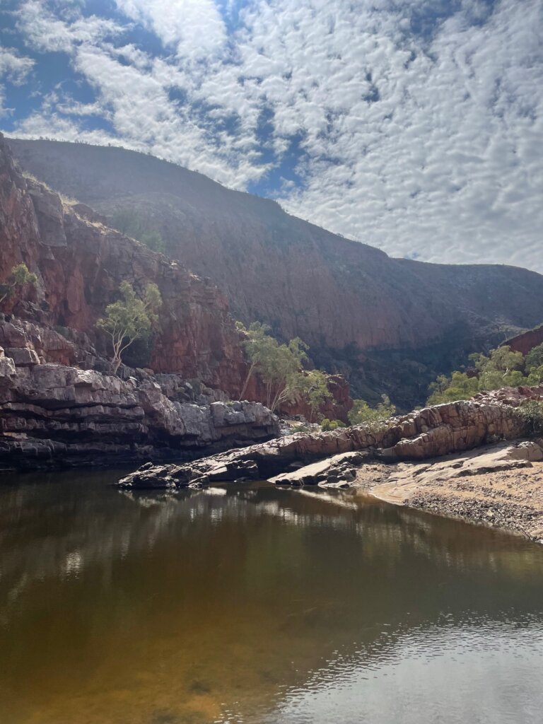 From there, we visited Glen Helen Gorge, an area where you can go down a little walking trail that takes you to a river running through the gaps of the gorge. I continued to be in awe of the rich, red rock in this area. It ain’t called the red center of Australia for nothing!