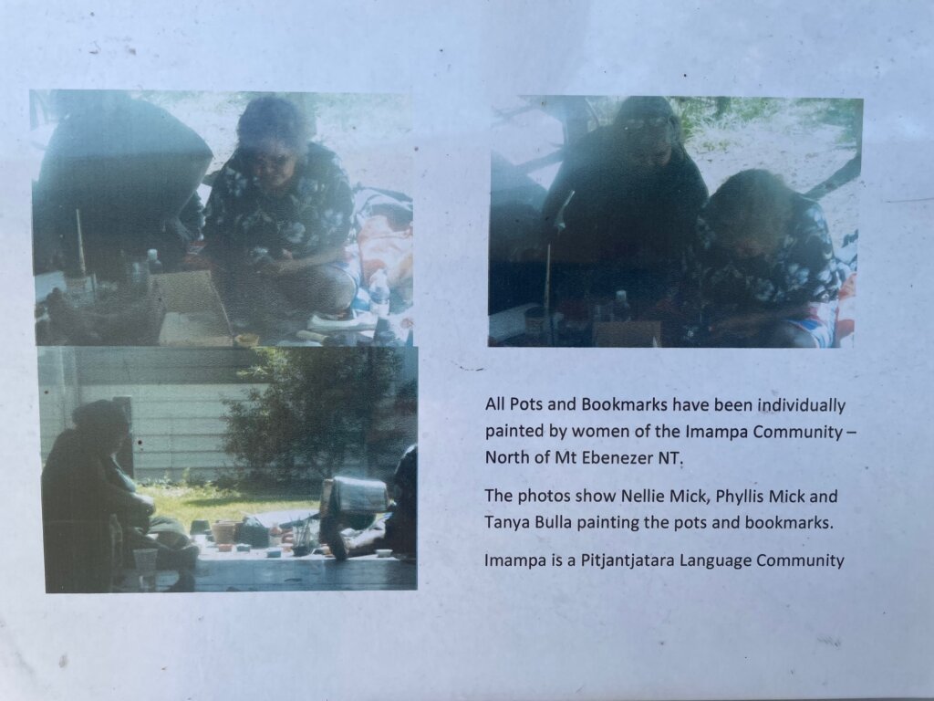 Once arriving in Alice, we went to “The Mall,” where local Aboriginal artists sell their paintings outside on the grass. There are also travel shops, art galleries, and more there. A lot of stuff is closed down currently. My travel buddy Michael is an Aboriginal art collector so that first day, we were stopping all over the place to see what the current merchandise was looking like. He has been coming to Alice Springs for decades, so he is familiar with the artists and their work. “Hi, Lynette! How are ya?”