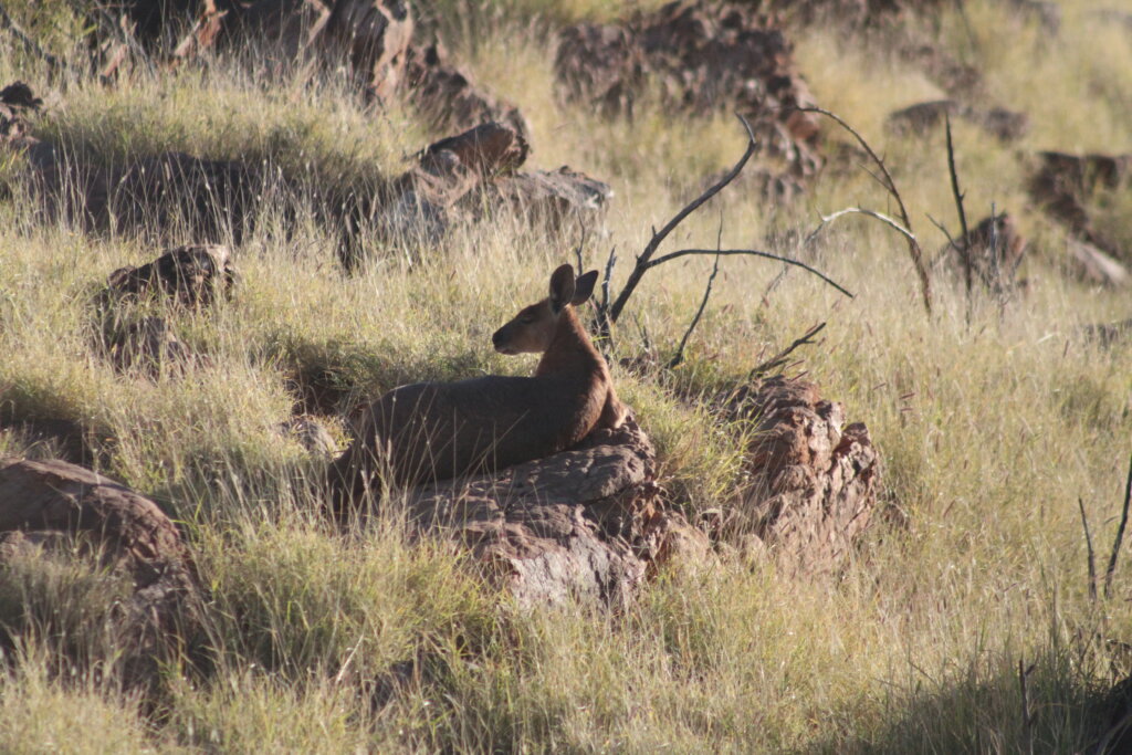 In the evening, we went for a drive to hopefully spot some red kangaroos. Sure enough, we saw two hopping away as we drove past! As it got dark out, there were cows on the road, so Michael was extra cautious while driving. Along the way, you could spot old skid marks on the road – people in the past had clearly needed to swerve to avoid the cows and wildlife.
