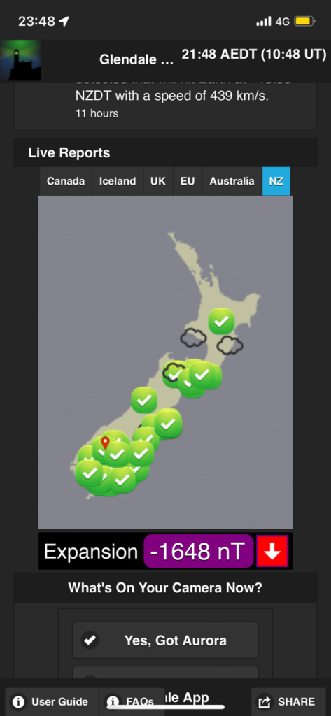I checked the app again and saw that practically everywhere in New Zealand, people were reportedly seeing the aurora.
