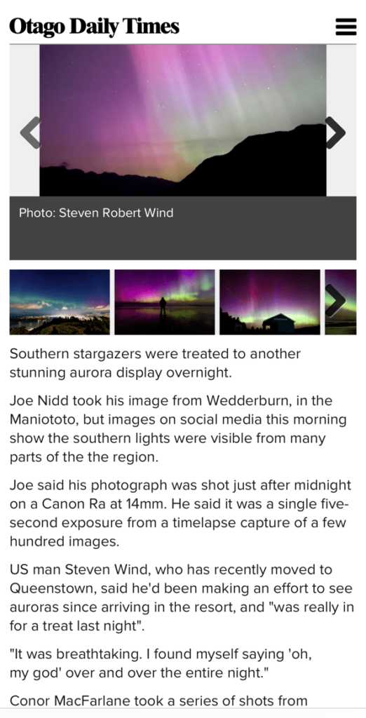 This morning, I decided to reach out to the local news in Queenstown to mention my aurora experience. Funnily enough, a little blurb and picture from my aurora experience got added on their page! They didn’t even tell me they were posting it, I just was looking up aurora news from last night and saw my name on there hahaha.