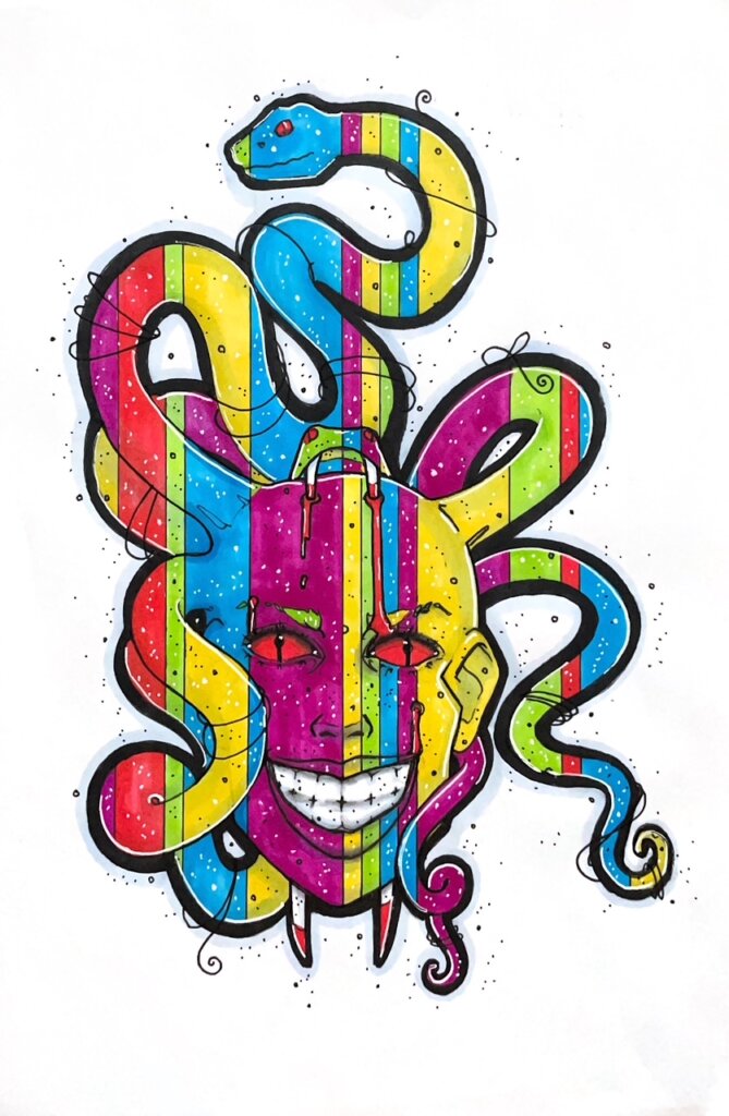 I’m not completely pleased with this guy BUT I think it was a good learning experience for me. I am trying to draw creepy-smiley-teeth and I think that part of it is definitely working. Some other things, not so much. I don’t know why I can make profiles of faces look so decent but straight-on is such a challenge at times? That’s okay. I will continue to learn and create, baby!