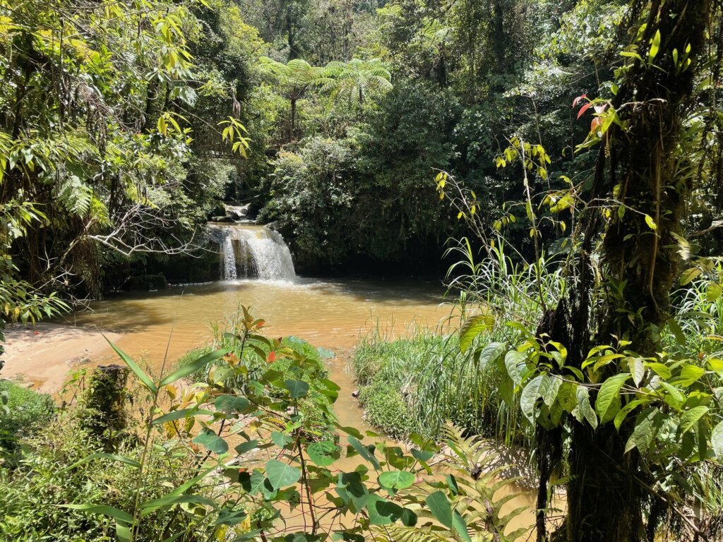 The trail started at the edge of town, near a petting zoo. After passing the zoo, the area quickly transformed into jungle-y terrain. Maybe ten minutes in, I was able to see the first falls, which I guess maybe is the Upper Robinson Falls?