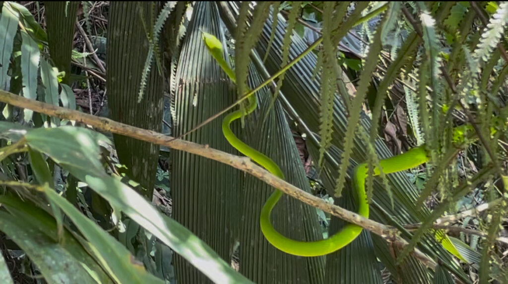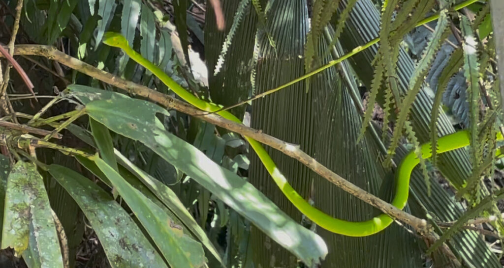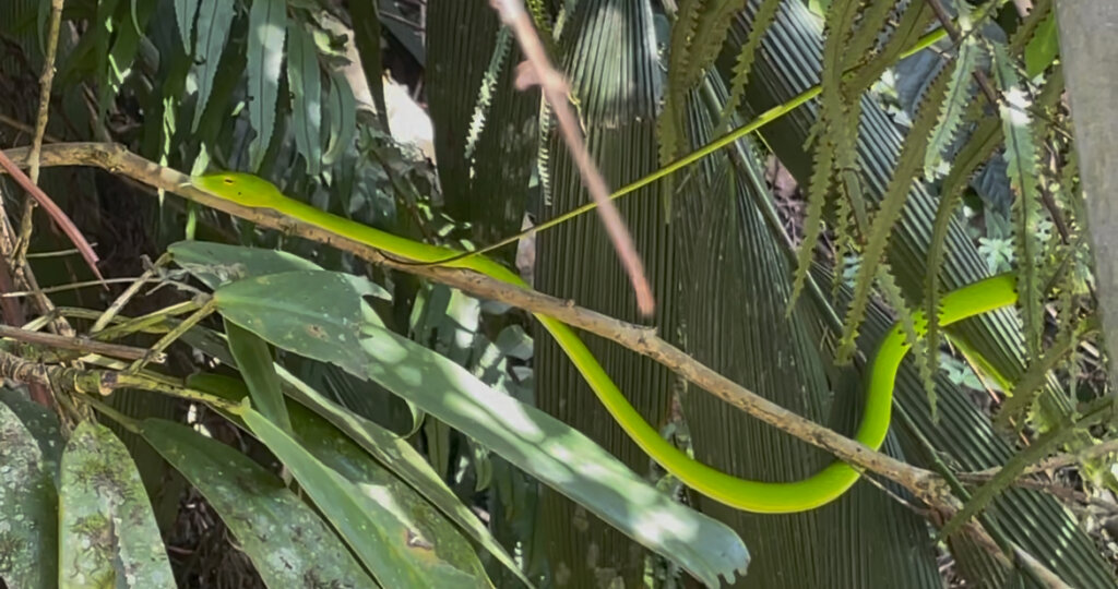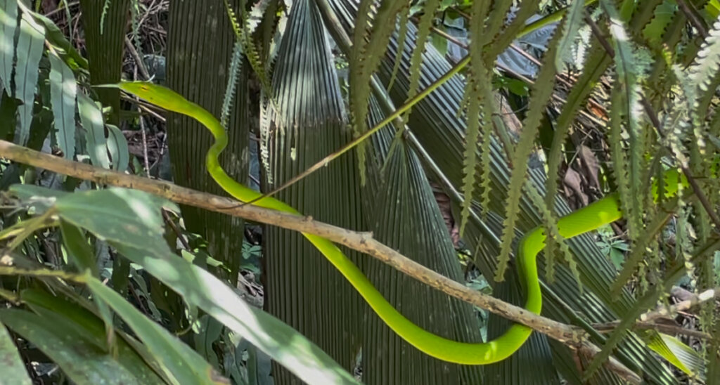 I was pleasantly surprised to spot something bright green to my left at one point. Could it be..? And it was! An Asian vine snake, just at the edge of the jungle. I watched it slither around through the foliage. It flicked out its tongue in the goofy way that those snakes do. At one point, it just looked at me for a moment and then moved deeper into the bush. What a nice sighting, though! The only other time I’d seen a vine snake during the day, it was practically motionless and I didn’t have my phone with me (that was on the sailing trip from Flores to Lombok).