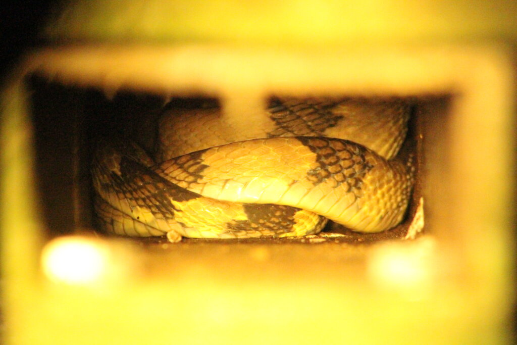 A dog-toothed cat snake, ALSO coiled in a burrow!