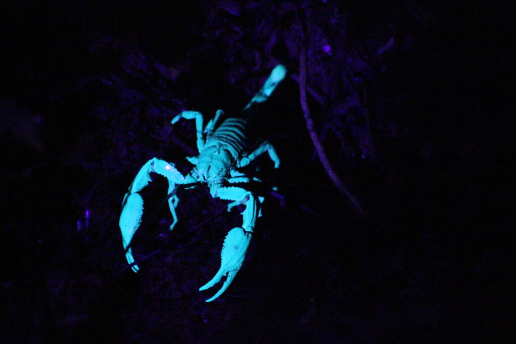 Fari asked us to turn off our flashlights and then he turned on his UV light. With a small stick, he poked around near the entrance of a scoprion’s burrow. It peaked its claws out and then eventually revealed its entire body. It was so awesome to see it glowing under the UV light. What a fascinating ability. I also learned that not only do they glow under UV light, but under a full moon as well.