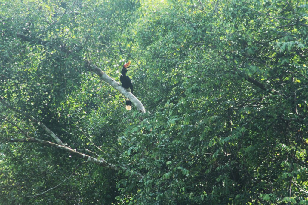 I exited the hide and then heard a familiar noise. The flapping of wings, but not just any wings. These wings were the wings of a hornbill! WHAT? I hustled back up to the second floor of the hide and happily shot some photos of a rhinocerous hornbill – the hornbill Shaun and I had been hoping to see when in Sumatra.