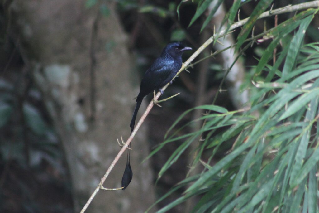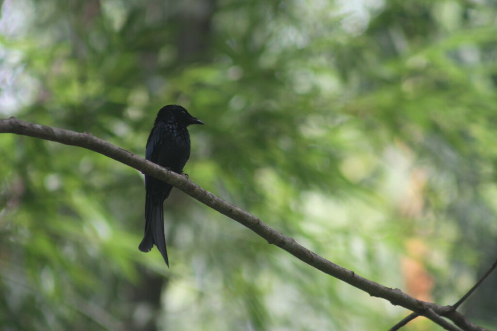Once I arrived back at HQ, I stopped at the birdwatching hide which went up six flights. It was pretty high up. I managed to spot a couple of racket-tailed drongos. I’d seen them before (was it Malaysia?). I think they’re the coolest birds – I love their little pigtails. I later learned that only the males have those plumes.