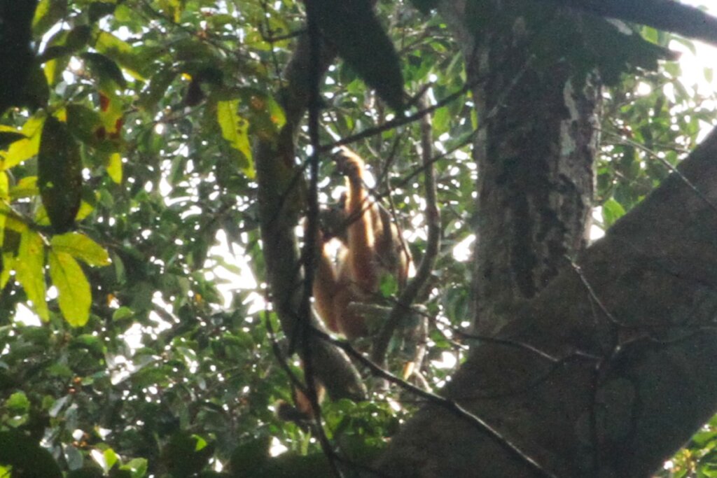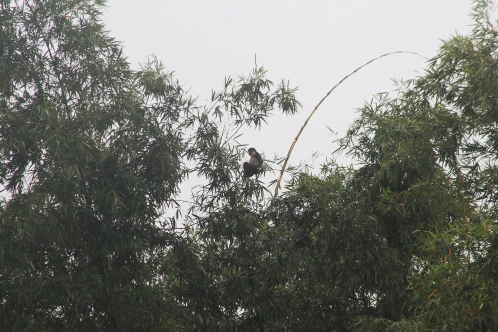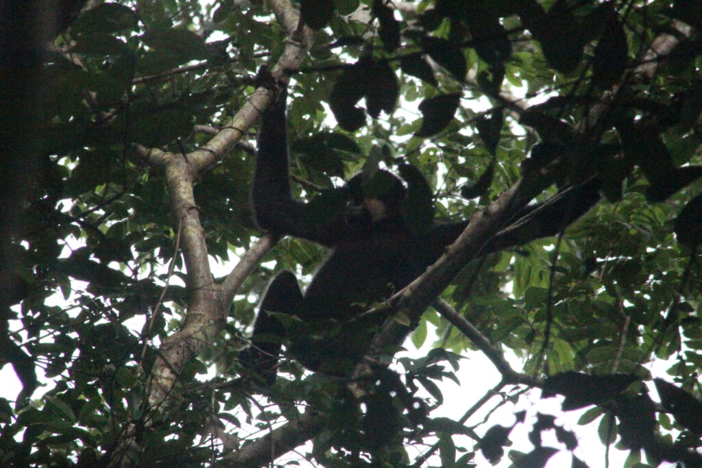 About halfway back to HQ, I was graced with another sighting that I wasn’t expecting… gibbons! They heard my noisy bike and started swinging higher up in the canopy. It was a pair – both a male and female. Yellow-cheeked gibbons are sexually dimorphic, so the males and females look very different. Males are black with yellow/white cheeks and females are pretty much yellow/golden all over. I saw both of them from afar but could hardly make out any details. The photos are terrible but I’m including them since I was so happy to spot them, albeit briefly. (It also made me glad I didn’t spend $50 for the potential to see gibbons because I got to see them on my own! Now that $50 can go towards some other tour lol.)