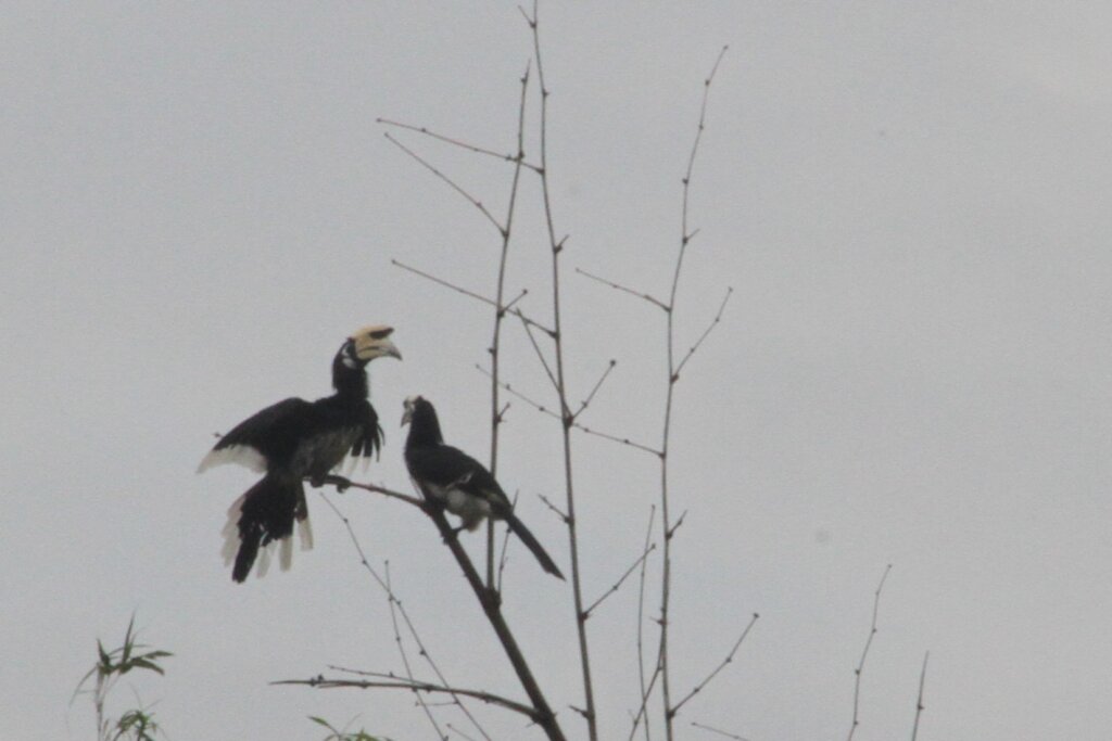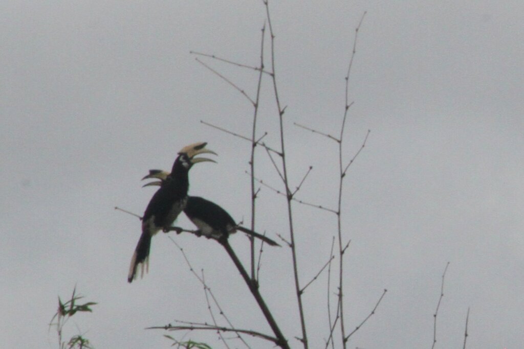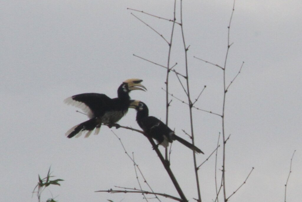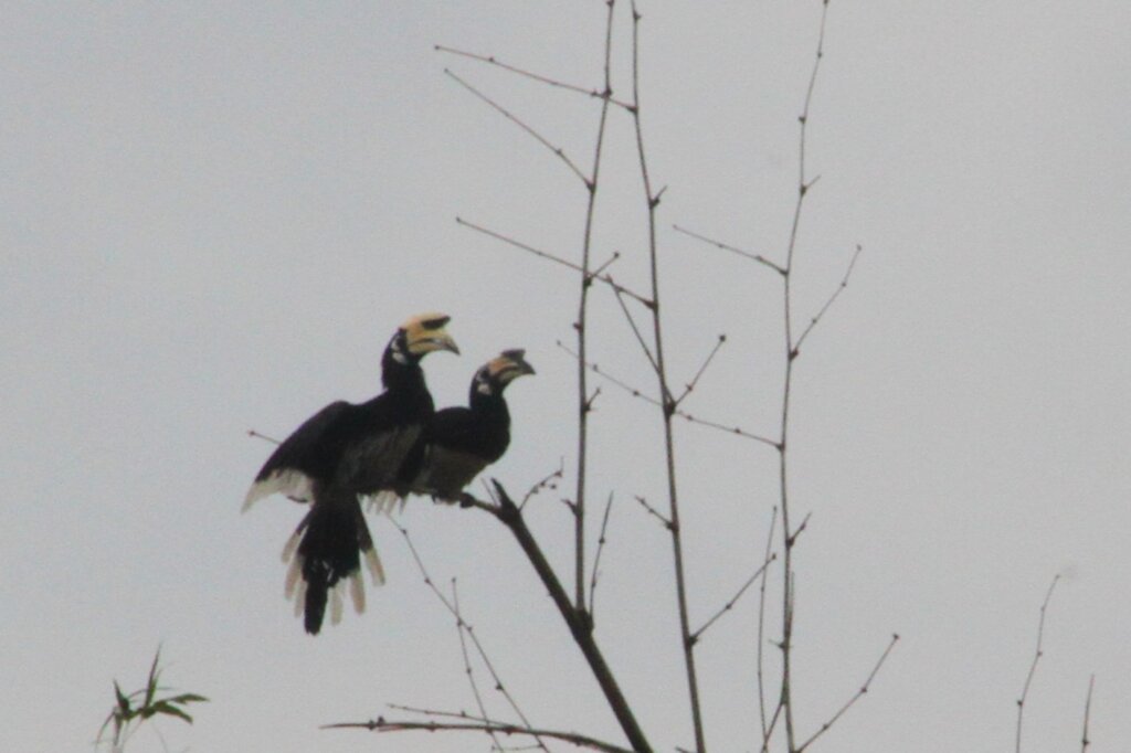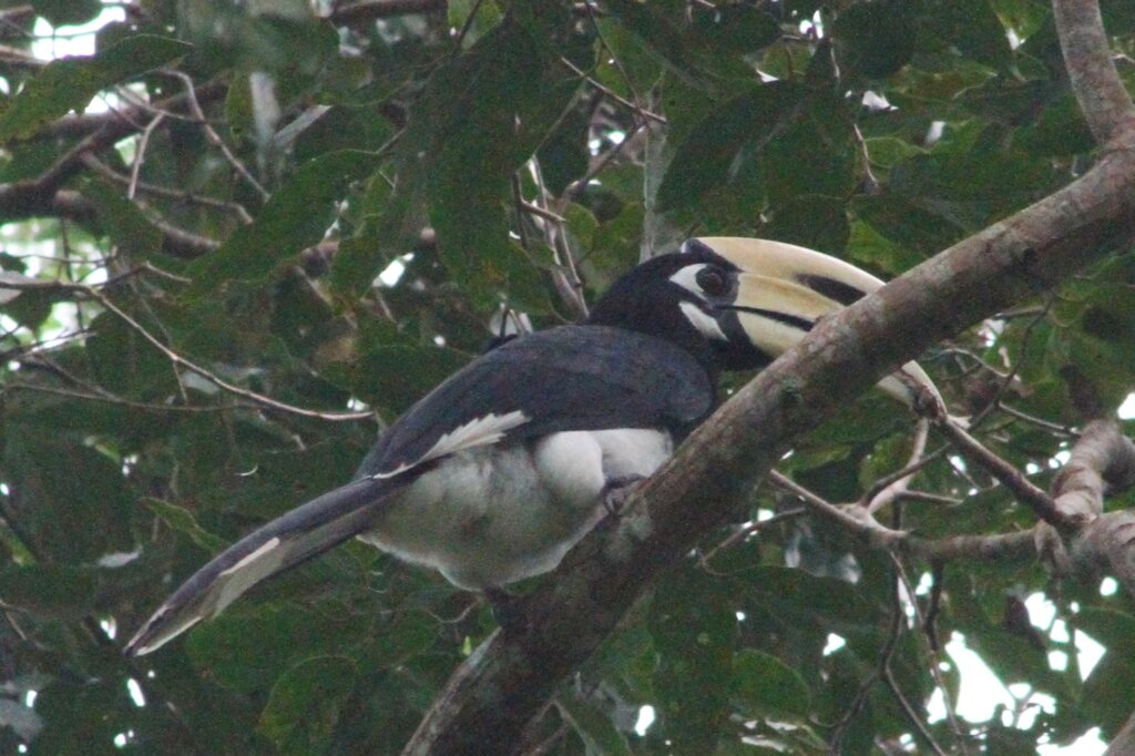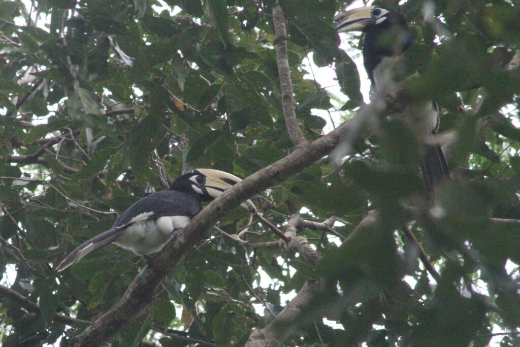 Every now and again, I’d look towards the river to see if there were any cool birds or monkeys. After the rain stopped, I noticed two large birds along the top of the canopy. Is that… could it be..? I went to grab my camera and with my zoom lens I was able to confirm – YES, there was a pair of oriental pied hornbills taking a breather!