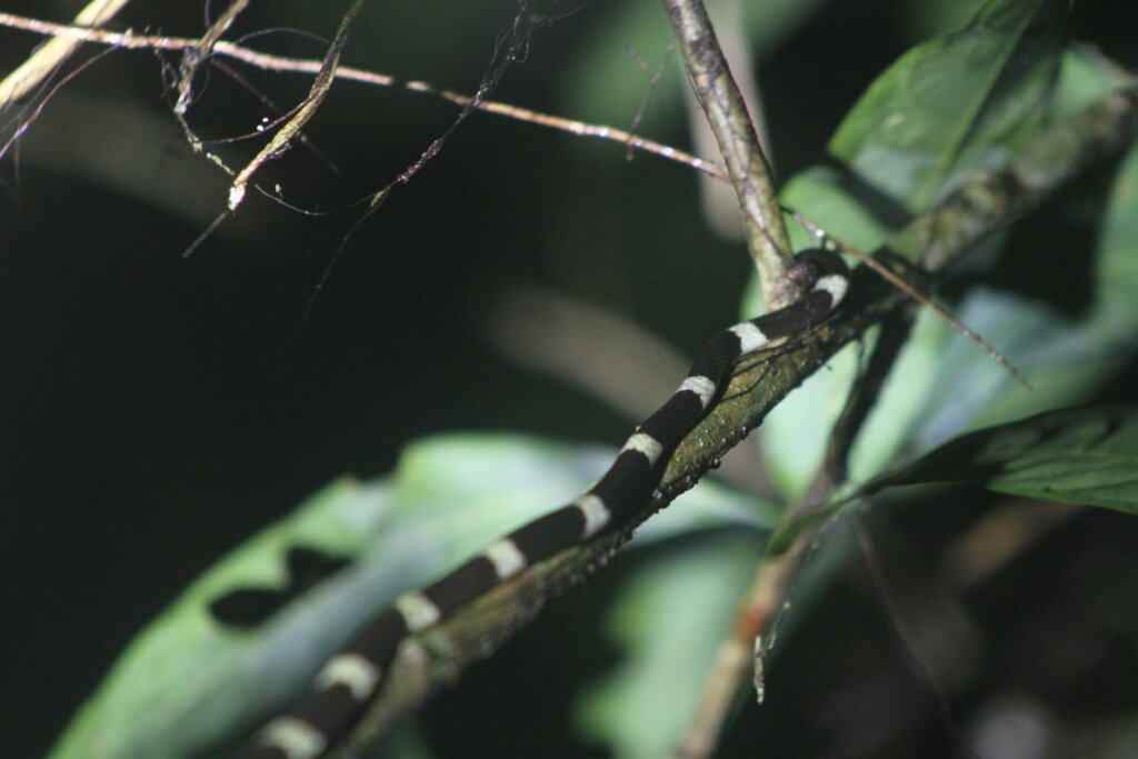 Maybe thirty minutes in, I managed to spot it: A SNAKE! Was it… was this a banded krait? No, absolutely not. A mangrove cat snake? No. Khanh told me it was a common bridle snake. COOL! A species I’d never seen before. We were all happy to see a snake. Khanh lit the scene as I snapped some photos. It was in a less than ideal position. At one point, Khanh kind of shook the branch and then the snake rearranged itself in a lovely display. I’ve mentioned this before – I prefer in-situ shots, not “staged” kind of things, but those staged shots really make for good pictures haha.