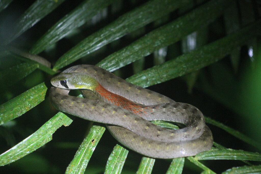 The viper was a good turning point for us. It was getting late, almost 11pm, and so we began heading back to HQ. Along the way, Khanh found a red-necked keelback resting on a palm leaf. So very cute!