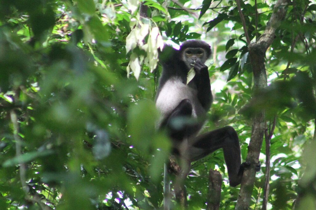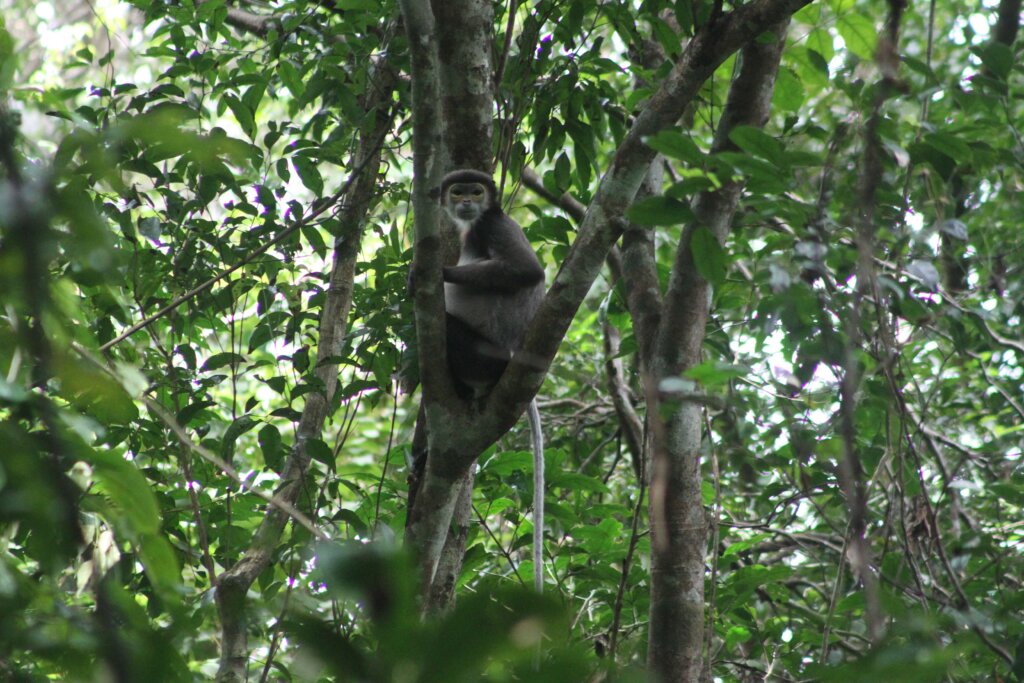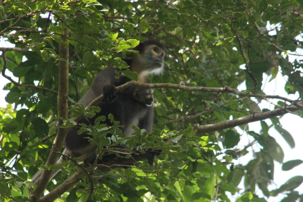 Along the way, I was pleased to spot a couple of black-shanked doucs jumping around in the canopies. I pulled over my bike but by the time I went to snap a photo, they usually had retreated too far away. I did manage to get one in time, though! Much closer than the shot I’d gotten on the boat tour.