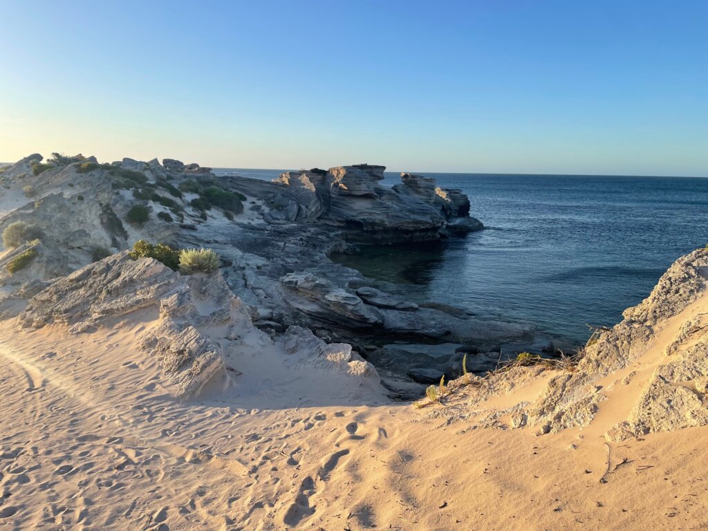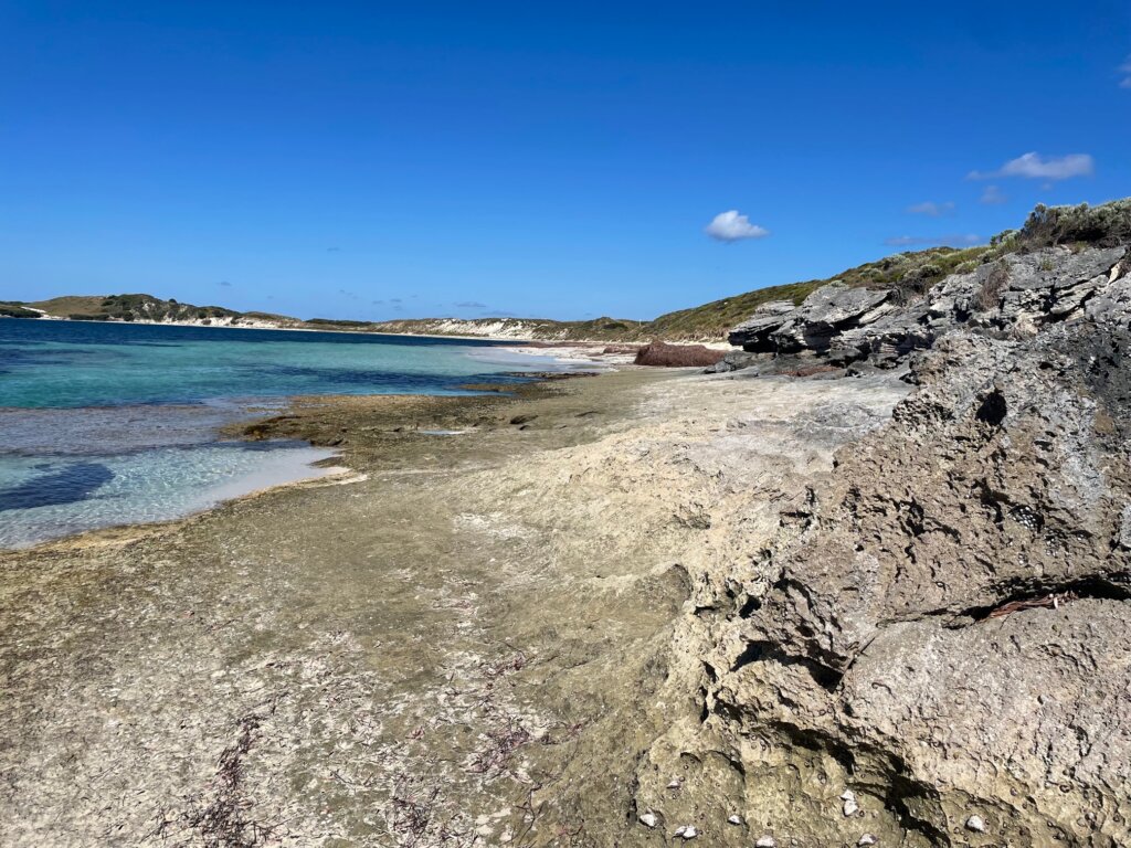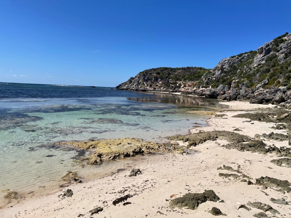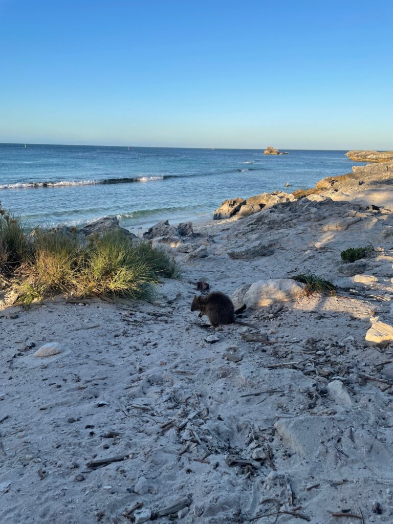 When I got to Little Armstrong Bay, I spotted a quokka and her baby in the wild. I stopped to watch them for a moment, crouched down on one knee. The momma jumped up and came to examine me – perhaps seeing if I had any food. She got up on her hind legs and pressed her nose to my knee. I was so touched!