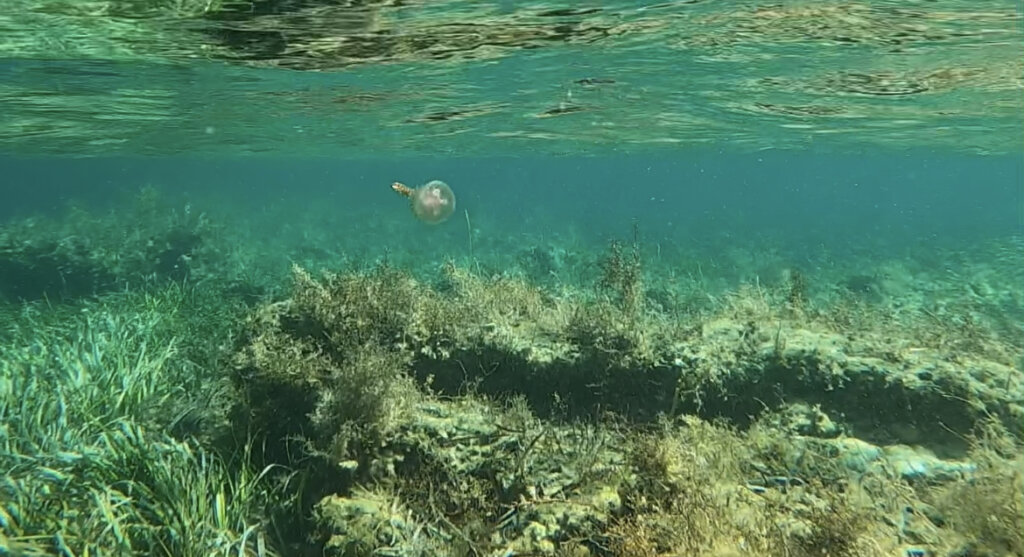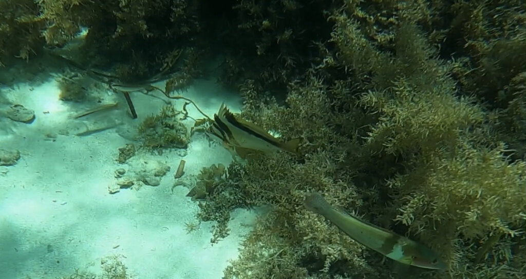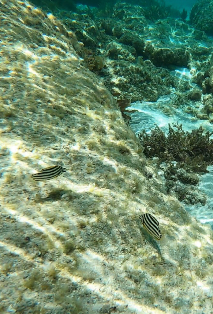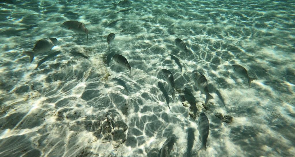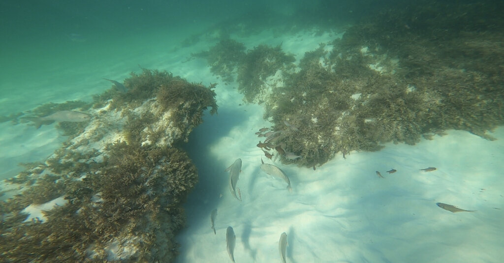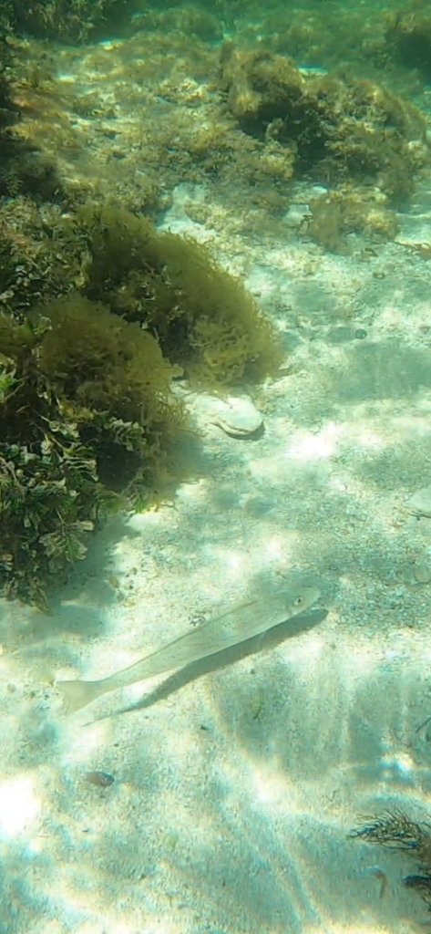 At first, there weren’t too many fish… but then they started to appear. There were lots of little fish hanging out in the seagrass, and I even saw a jellyfish. Mr. Victoria’s prized moment was spotting a crawfish that was hiding in a “cave” of sorts. I didn’t see the crawfish and as he dove down to get a closer look, he kicked up lots of sand, making the water murky.
