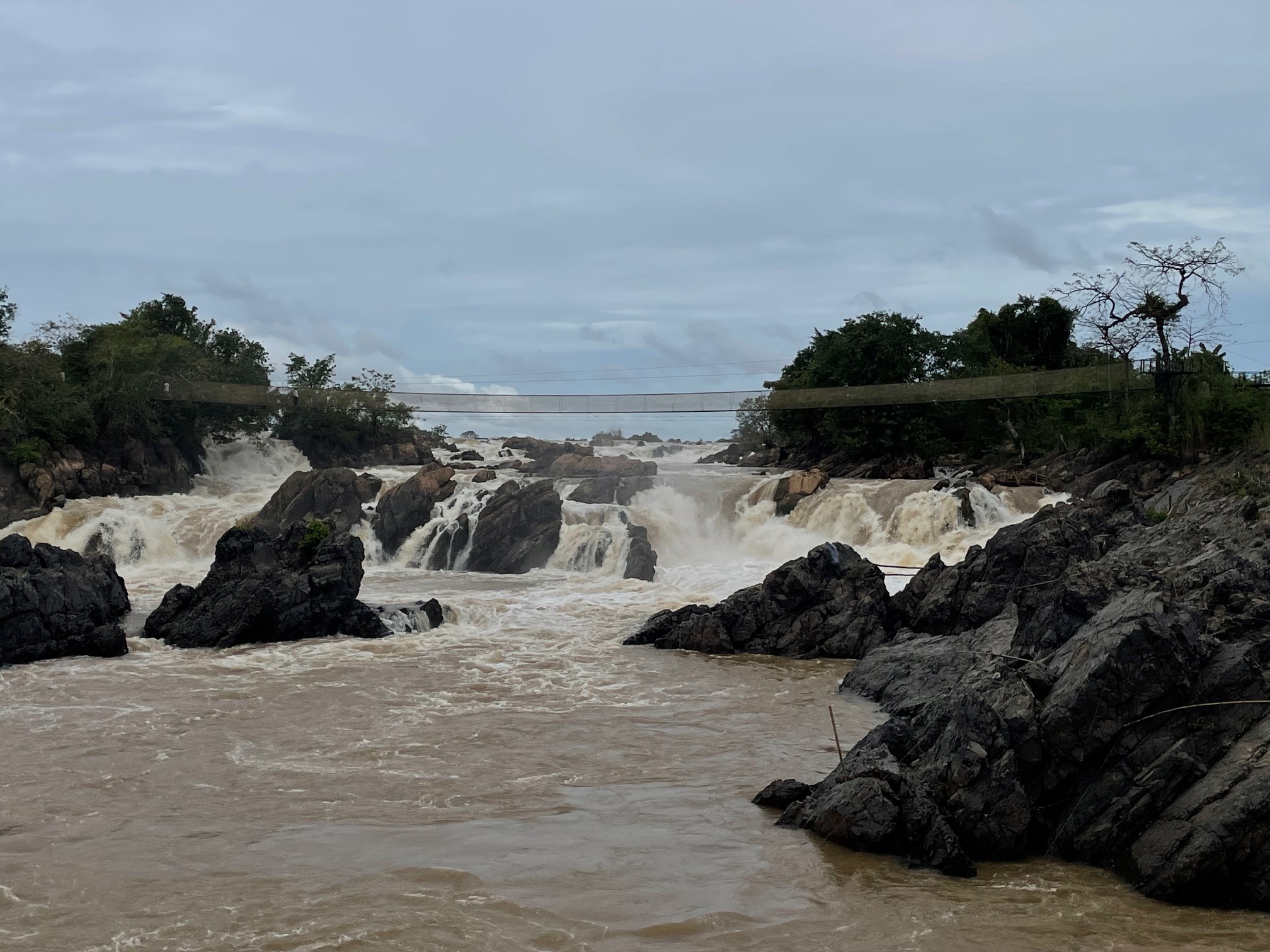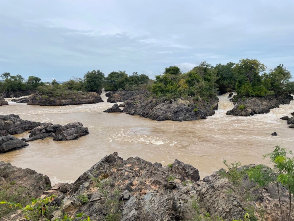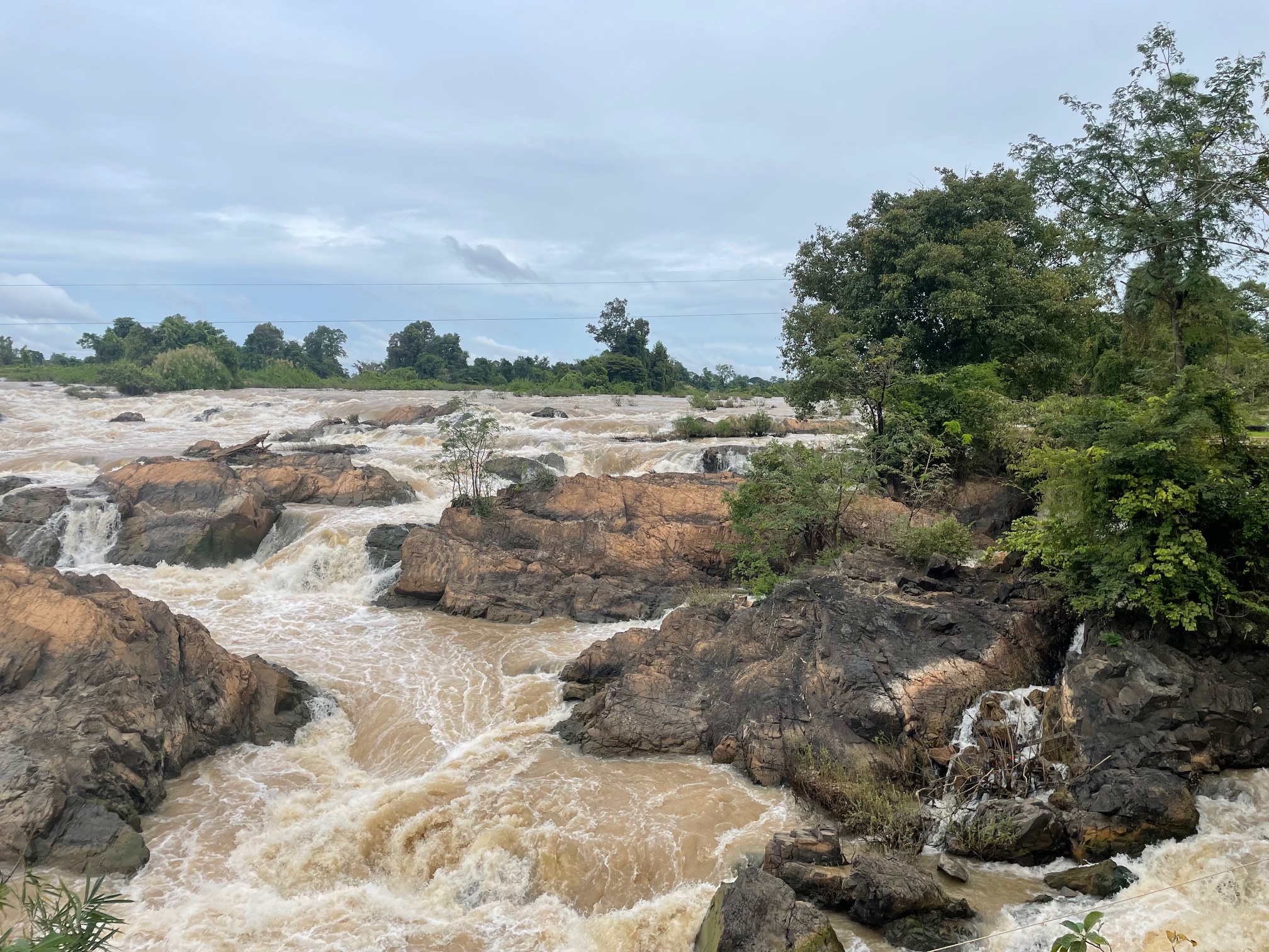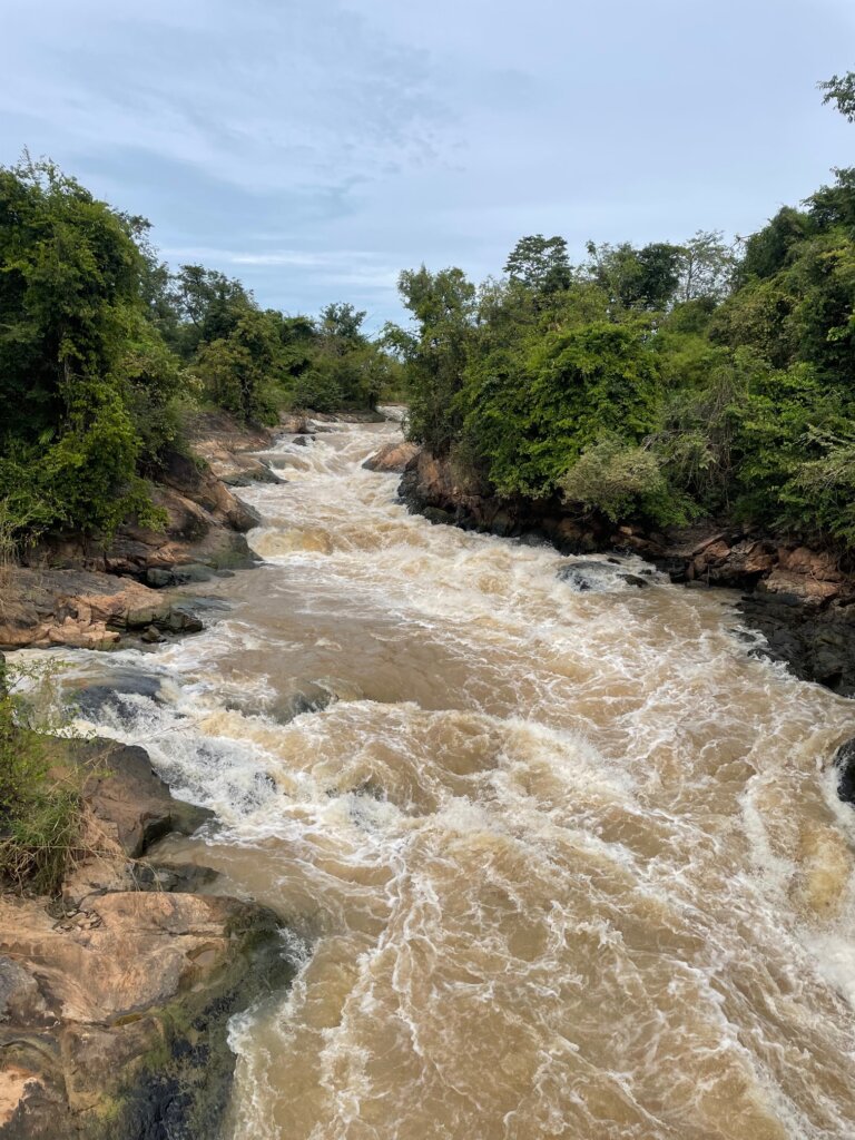My first impression was that it was less of a waterfall and more of roaring rapids. The water of the Mekong was so powerful, thundering endlessly between and over boulders. I was impressed. A number of others were enjoying the scenery, too. At one point, a few monks came by – always a treat to see. Nearby, there was a small Buddhist temple – I wondered if that was their main reason for visiting.