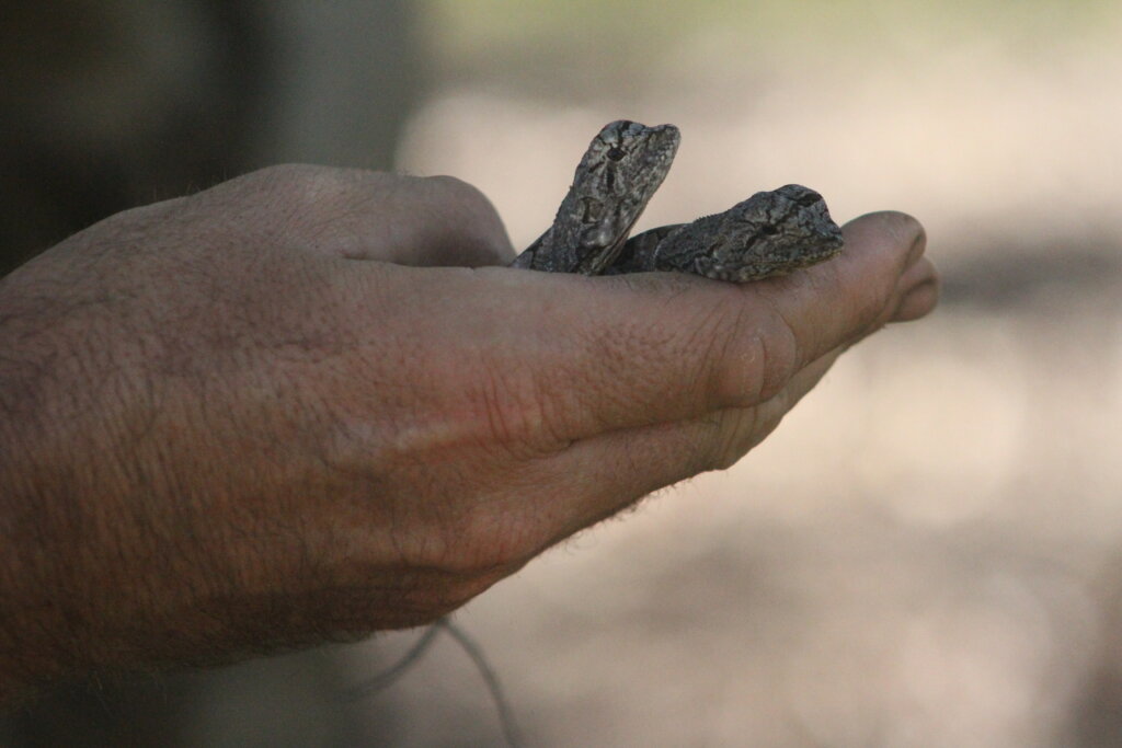 As Aaron and I were talking about wildlife, Darwin, and my time in Australia, he spots something and starts running across the park. And then he grabs a second baby frilly! And then not two minutes later, his son’s friend grabs a third baby frilly!