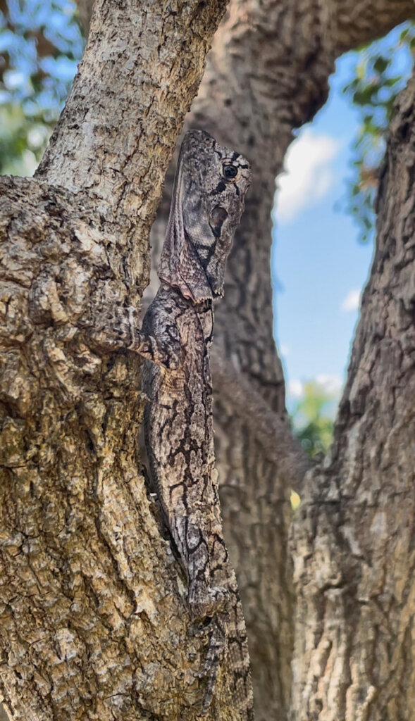 I had posted on a couple of different platforms to see if anyone had spotted them recently. Aaron, a guy from the Naturalists group, had posted that he saw some baby “frillies” just a couple of days prior. “So, they are around,” I thought, despite some people having claimed they haven’t seen any for years. They prefer the wet over the dry season, so much of the time, they are at the top of trees, mostly in a state of dormancy. The adults, anyway. I believe the babies are more active since they still have to bulk up on food.