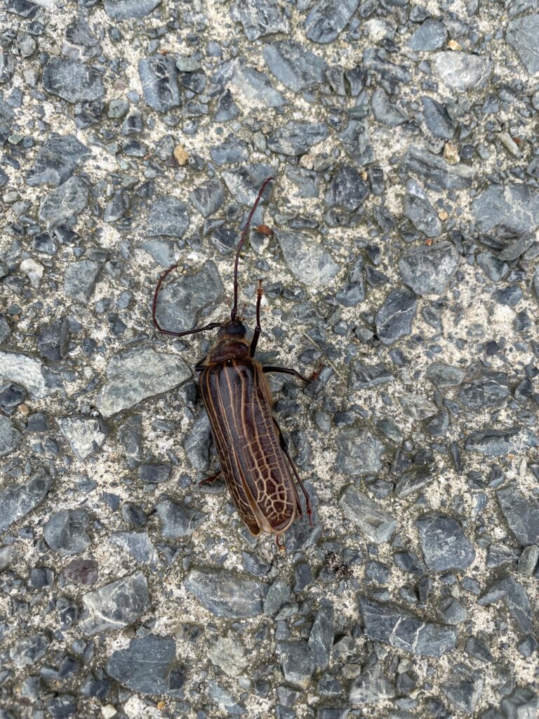 I saw a huhu beetle flipped over onto its back. It was struggling to get back up. I ended up flipping it around but it seemed like it kept having trouble. Something was wrong with its leg. I wonder if someone accidentally (purposely?) stepped on it, thinking it was a cockroach. I took some toilet paper from the bathroom and carried it into the bush, thinking that would be a better place for it to be than on the concrete outside the bathroom. I later saw a few other beetles who had died in a similar fashion on their back. Apparently those beetles have pretty short lives. Anyway.