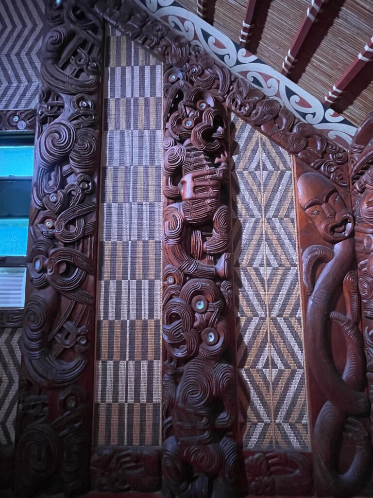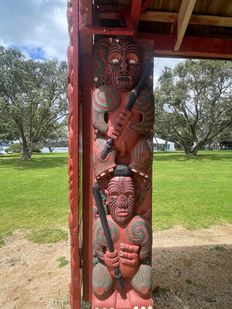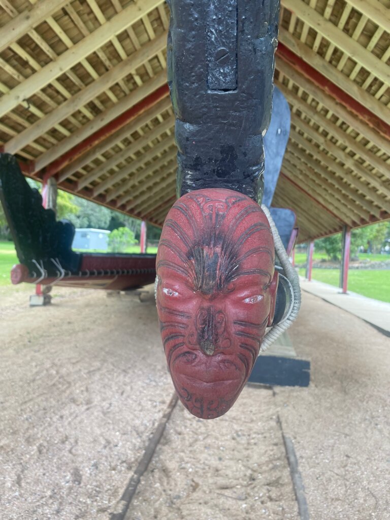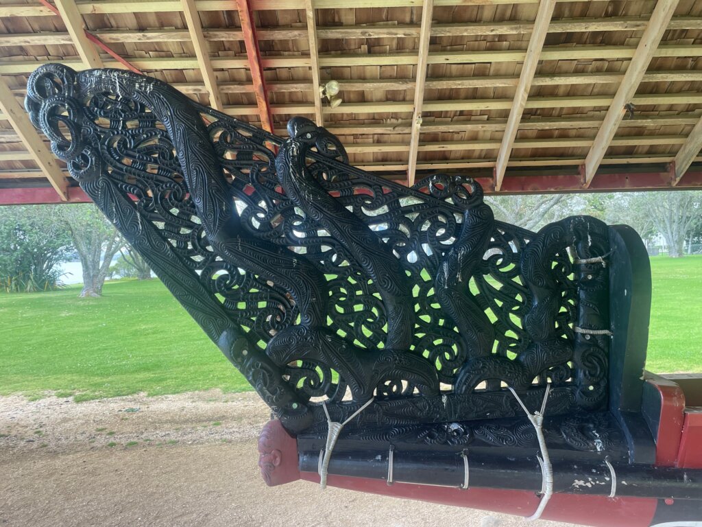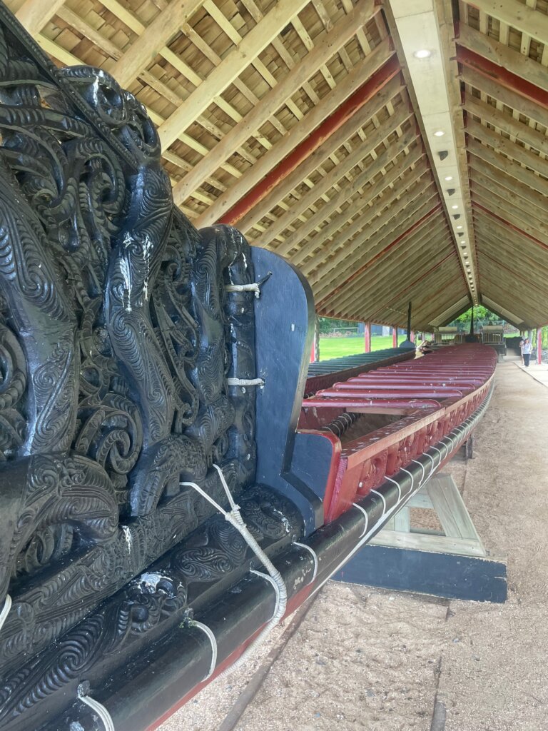 After wandering through the museum, it was time for the guided tour. Our guide walked us through the grounds and led us to a waka – the world’s largest waka. It was made from three different kauri trees. I’ll talk more on kauri trees later. The details of the waka were gorgeous!