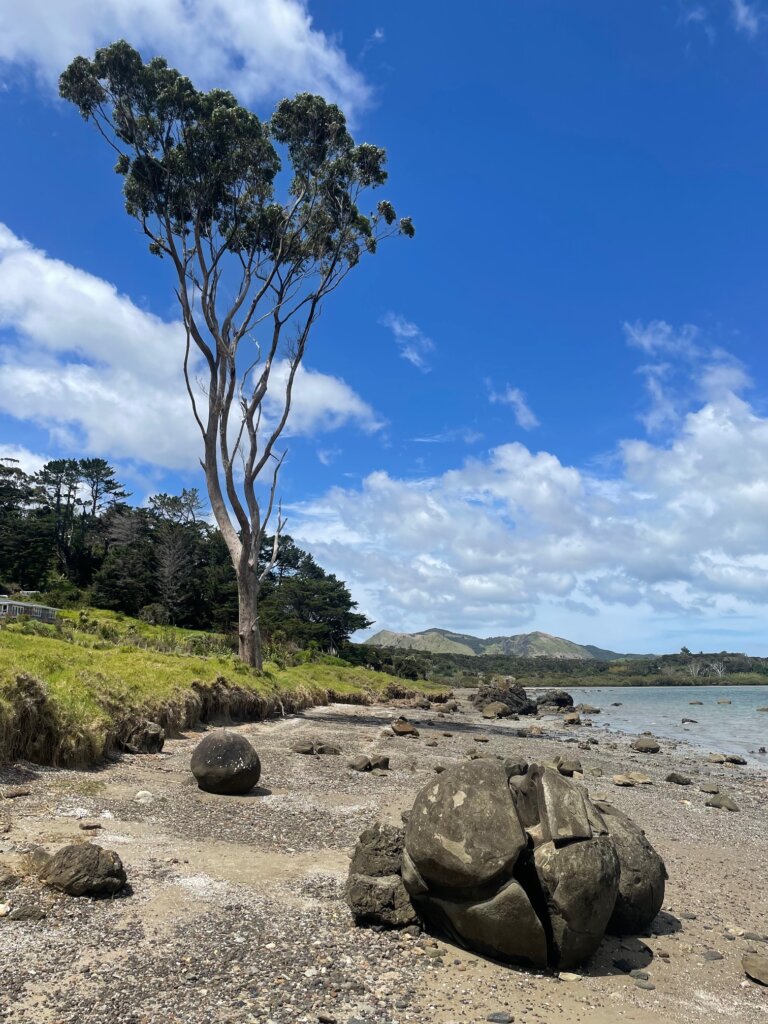 I had two hours of driving to get to my campsite. However, halfway through the drive, I stopped at the Kouto boulders. I didn’t know what they looked like, but I heard they were similar to the Moeraki boulders on the east coast of the South Island. I decided to check them out. They supposedly were best to view at low tide. Low tide wasn’t for another few hours but I decided to take my chances. GoogleMaps wrongly led me into someone’s backyard. Two guys were hanging out on the porch with their dogs. I apologized profusely and asked if they happened to know where the boulders were. They said it was no trouble at all and told me where to park.