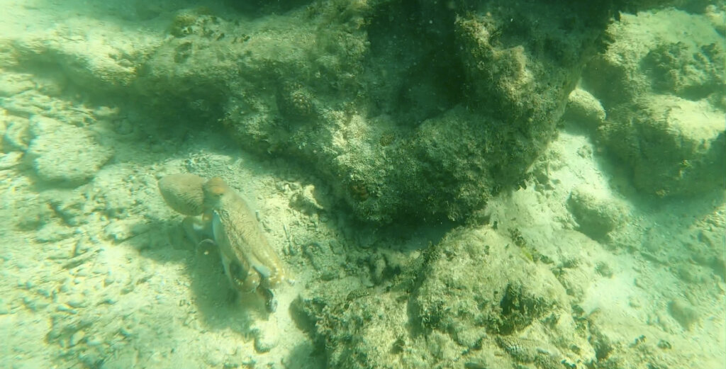 Not ten minutes into the snorkel, I spotted an octopus. The water was so clear and shallow. I was able to get much closer to it than the octo-friend I made in Coral Bay. It had a fish friend following it – its protector, perhaps. I recalled that the Coral Bay octopus had a fish friend, too. Maybe they have some sort of symbiotic relationship?
