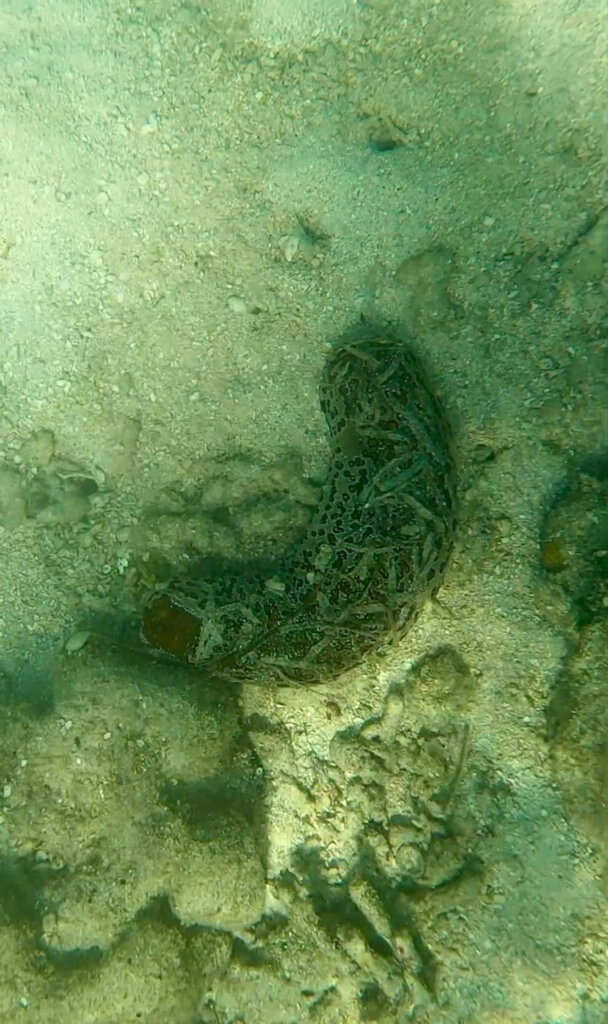Indy pointed out what we think was a dead sea snake – but it was partially obscured in the sea grass, so we weren’t sure. There were also a few gigantic sea cucumbers around!