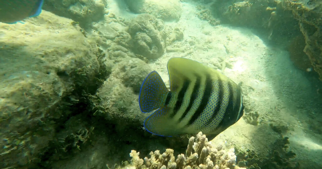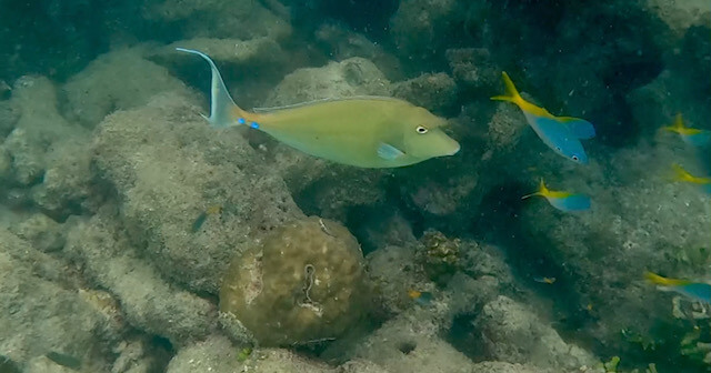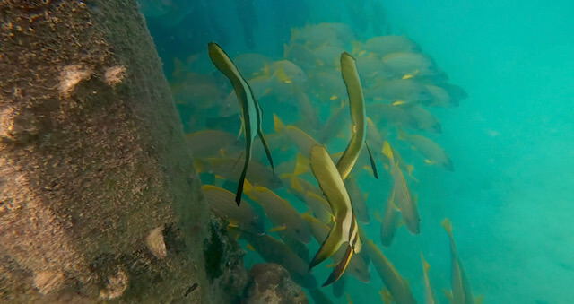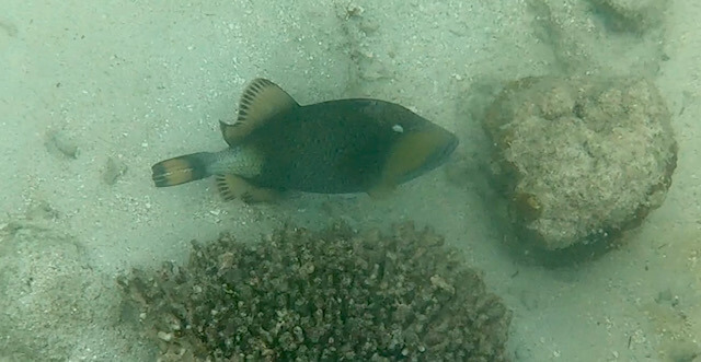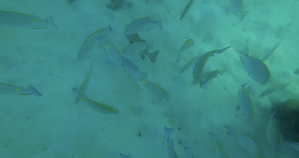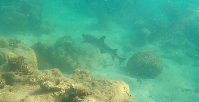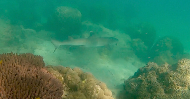 Further out from the jetty, I spotted the shadow of a shark swimming along. It was the first time I’d seen a shark while snorkeling on my own – before then, it was only during a tour. I expected I would be frightened, but it was far enough away, it didn’t worry me. Indy wasn’t able to see it. I spotted the shark a second time, too. I think it was a reef shark. Definitely not large enough to be a tiger or great white. It was hanging out in the deeper water, away from the jetty.