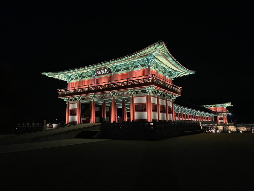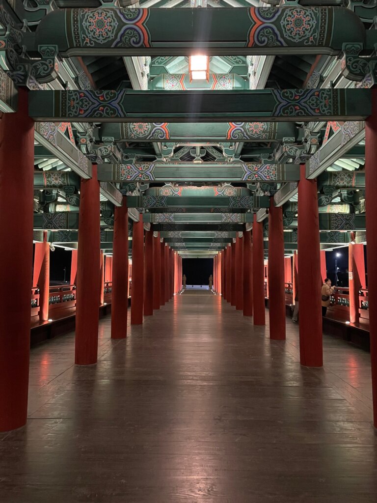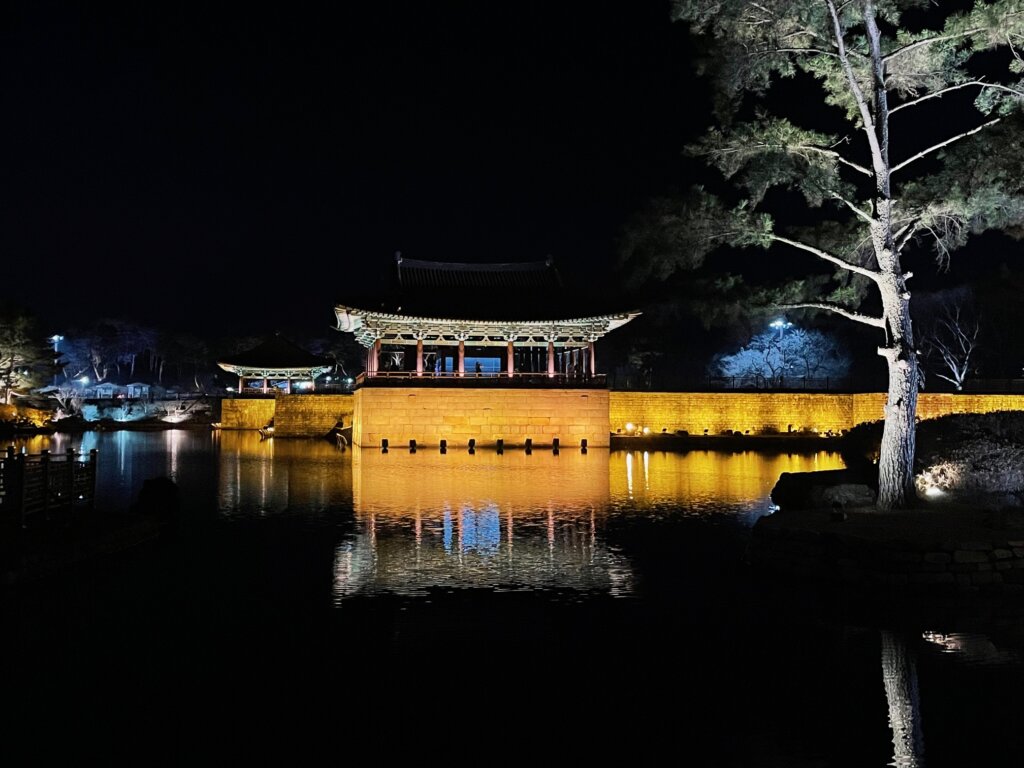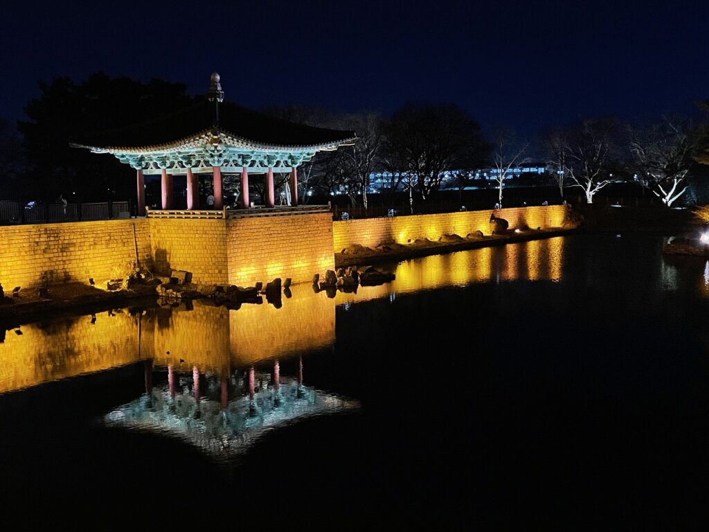 I decided to walk to Donggung Palace and Wolji Pond. I’d read it was supposed to be a lovely area, and really nice for sunsets and at night. Had I known I had to pay (again, a very small fee, like $1 USD), I would have gone during sunset. The pond was quite calm and reflected the palace structures, which were lit up very beautifully.