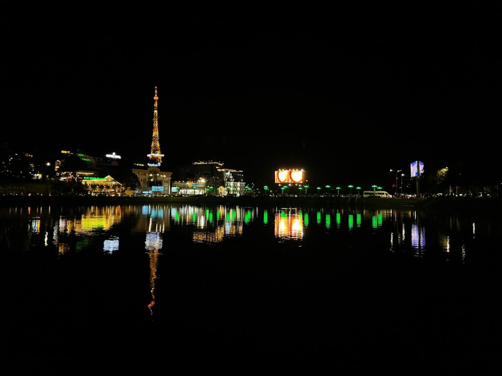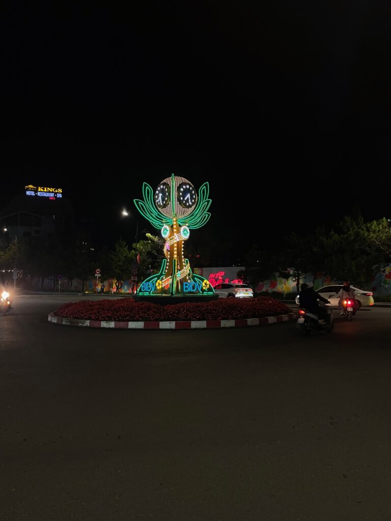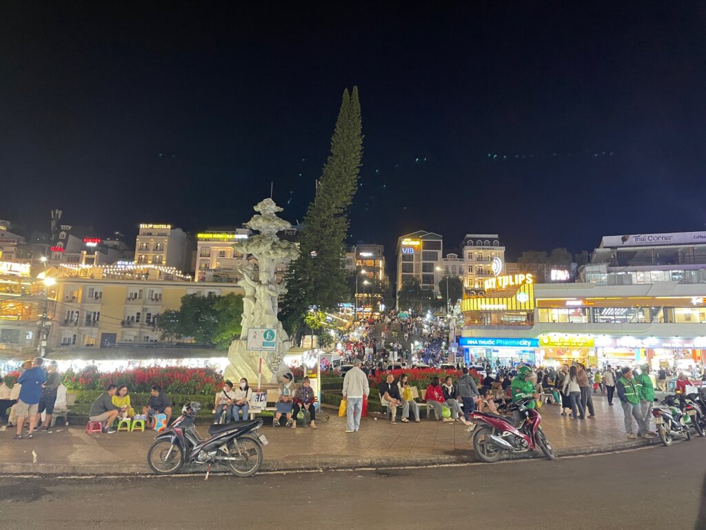 I walked down to the lake and got a (maybe) better photo of the tower reflected in the water. Then I returned to the night market. It was truly so lively. They had street performers painted silver, painted gold. There was someone in a giant Labubu costume, a monster costume, etc. I was also surprised to see a number of blind people asking for change. How many blind folks are there in Đà Lạt? A lot, apparently. I must have seen five that night.