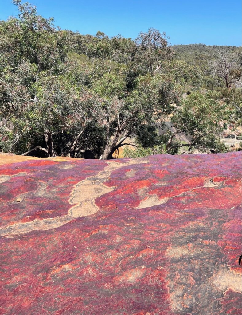 The first stop along the way was the National Park Falls. Waterfalls! Oh, how I love them. But alas, dry season has begun in Western Australia, and there wasn’t a waterfall to be seen. However, we were able to walk atop the rocky outcrops where the water usually flows. The rocks were incredibly red – redder than the picture I’ve attached makes them appear. Jason reckons the rich hue comes from the iron in the rock… perhaps exposed from the constant flow of water eroding the rock in the winter months.