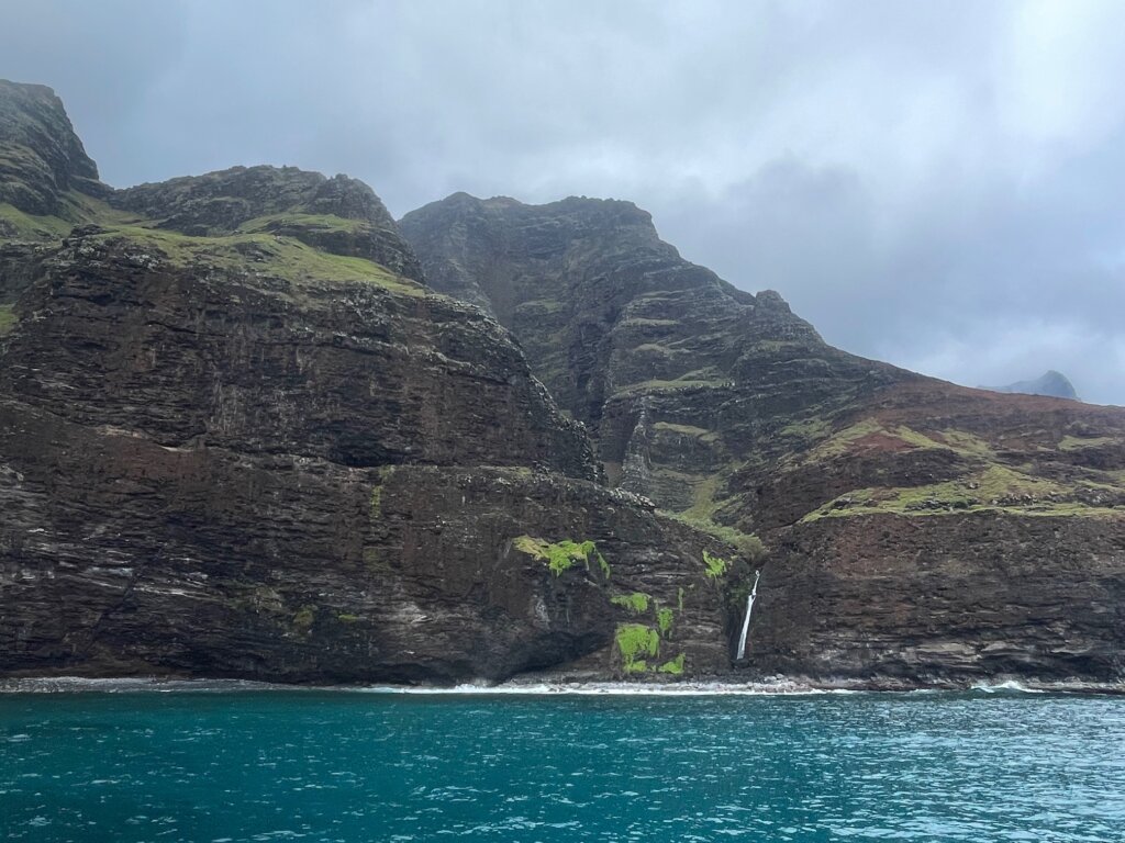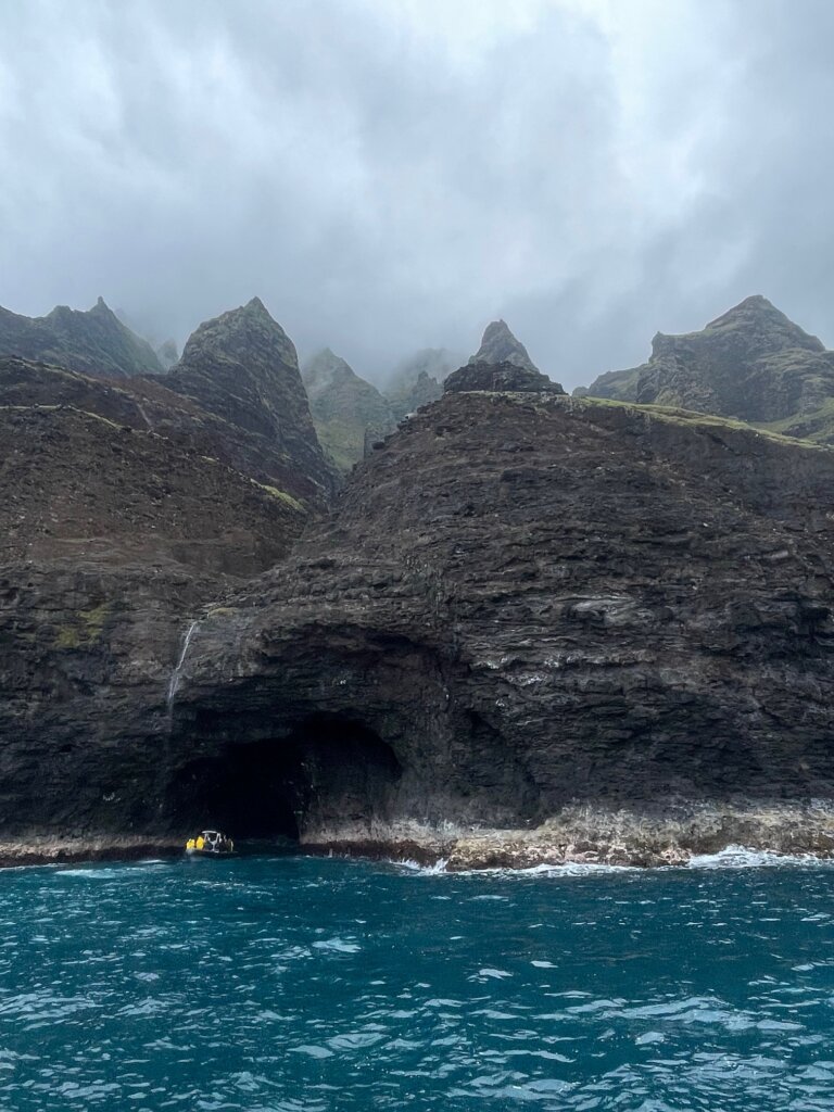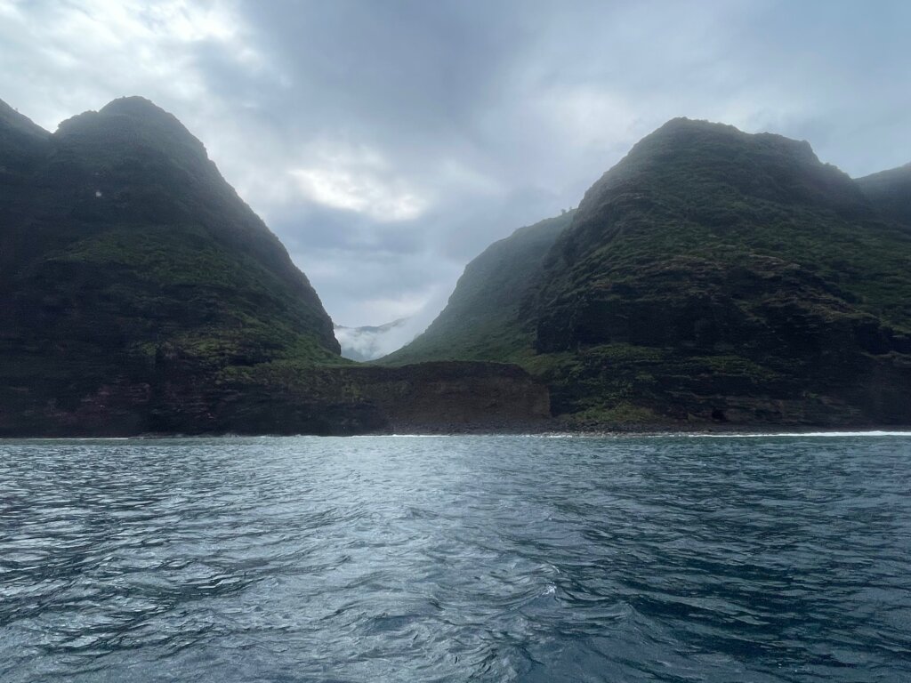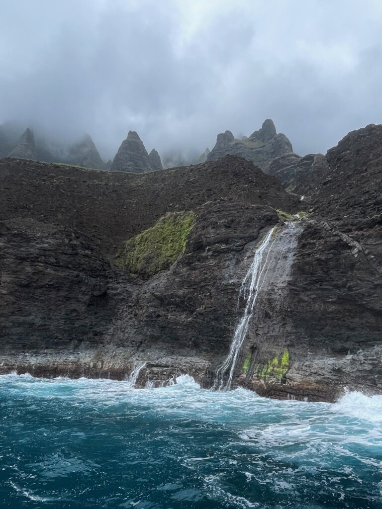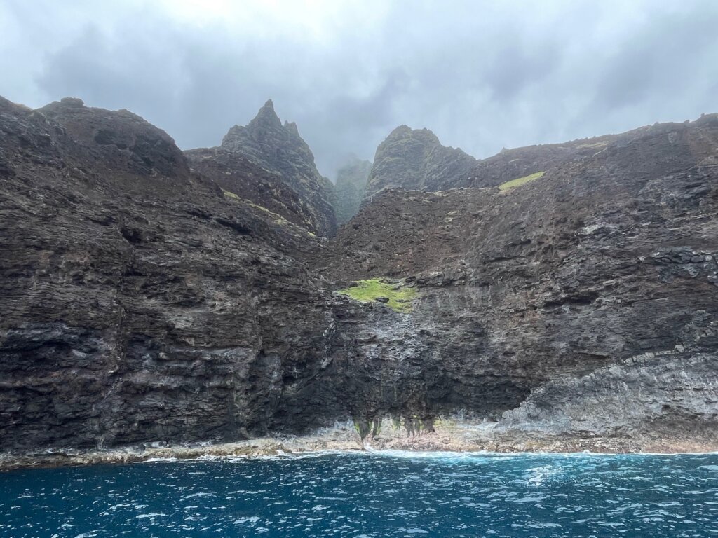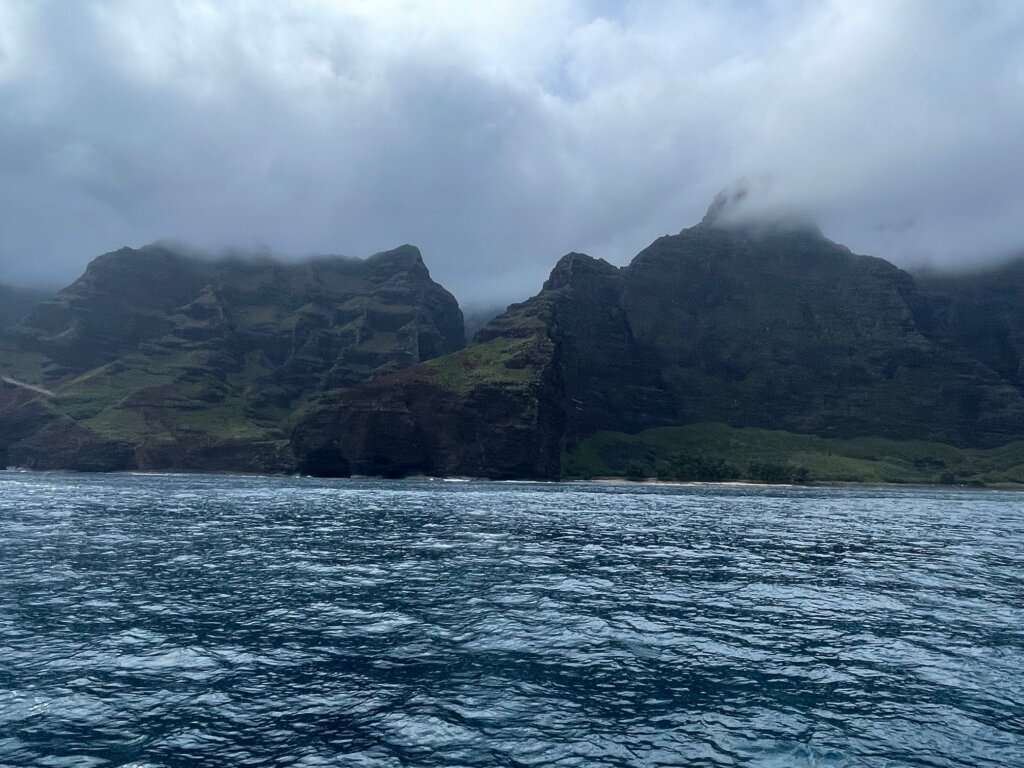A little after 7am, we were walked to the boat. The rain was consistent but not overly heavy. After boarding, we all sought shelter under a nook tucked away (mostly) from the elements. Despite the rain, the ocean conditions weren’t bad. The waves were fine and we were able to journey towards the Nā Pali coast. It would take over an hour to get there.
