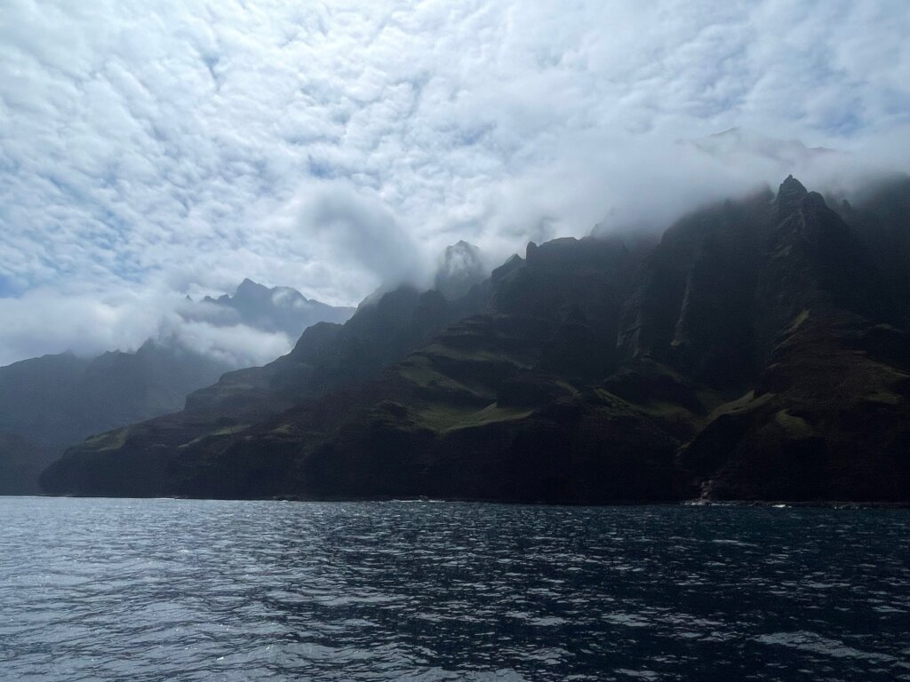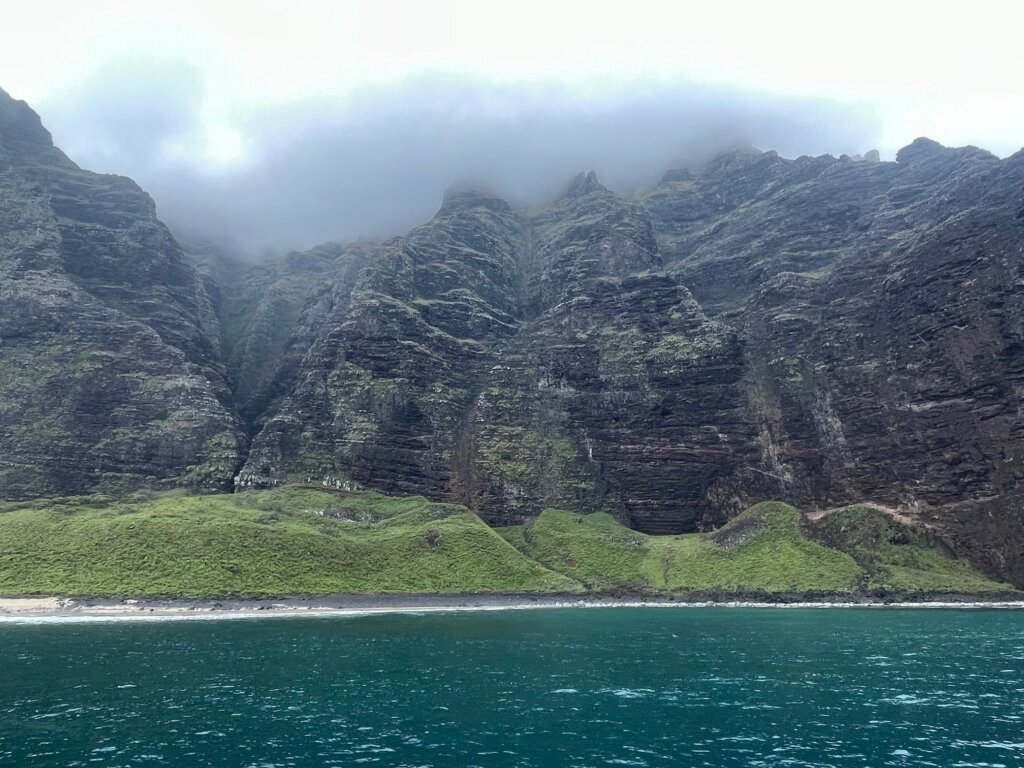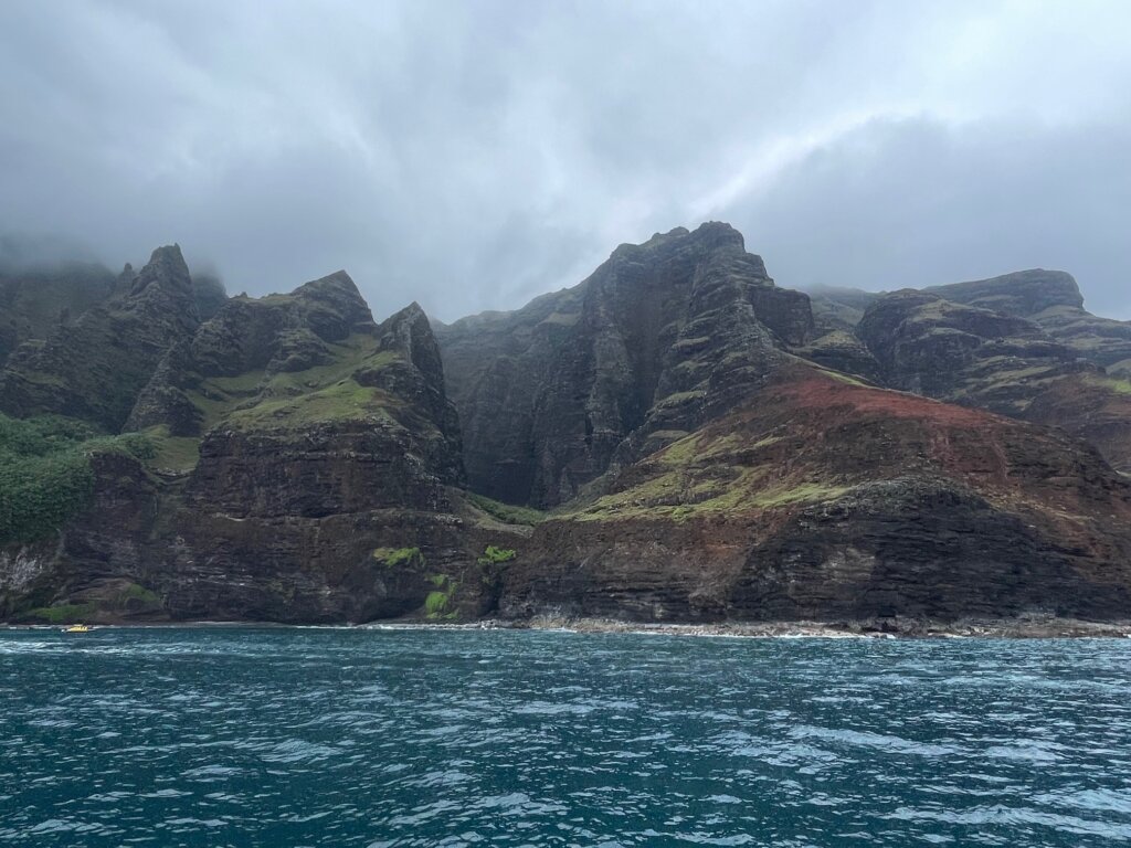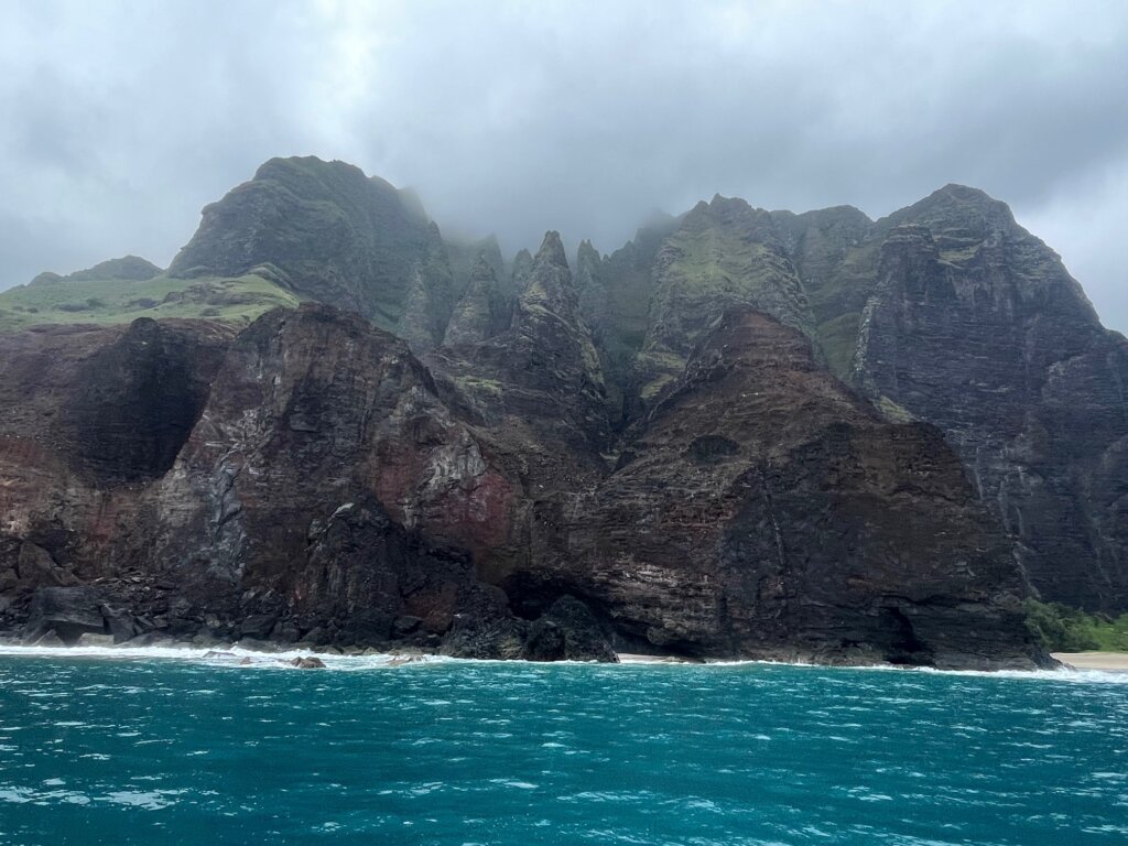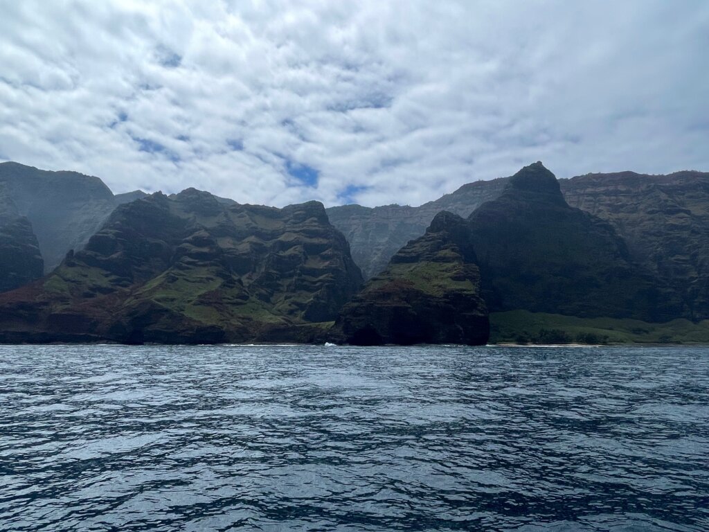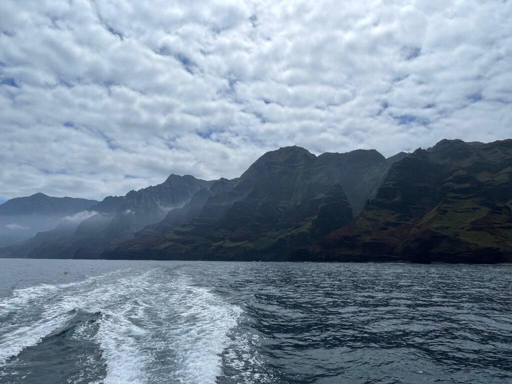 A little after 7am, we were walked to the boat. The rain was consistent but not overly heavy. After boarding, we all sought shelter under a nook tucked away (mostly) from the elements. Despite the rain, the ocean conditions weren’t bad. The waves were fine and we were able to journey towards the Nā Pali coast. It would take over an hour to get there.