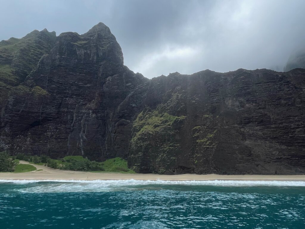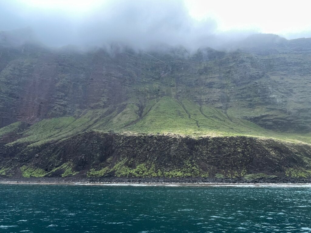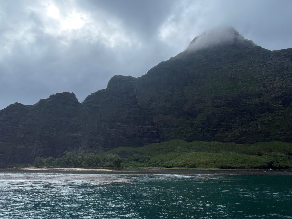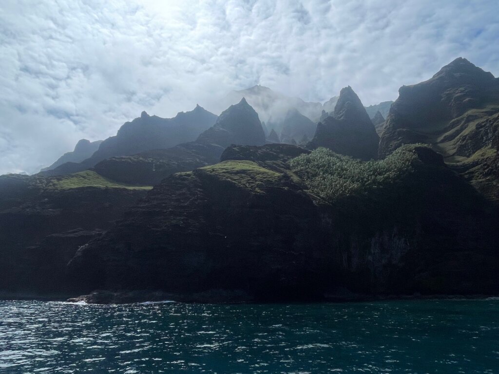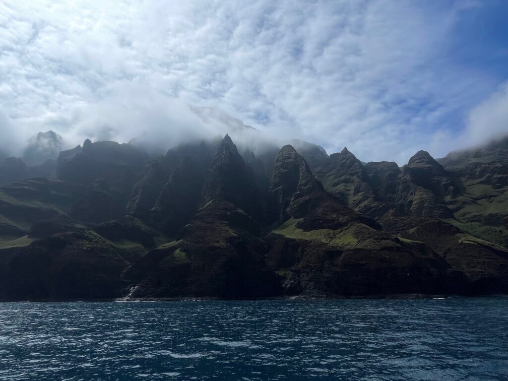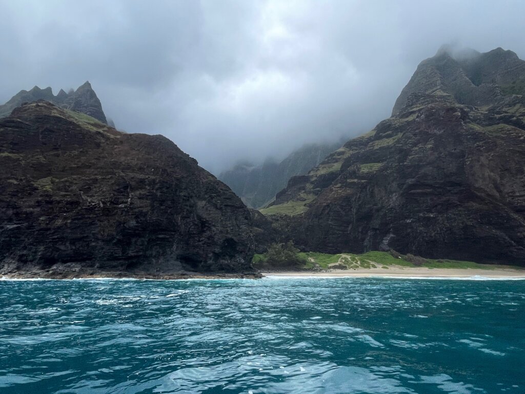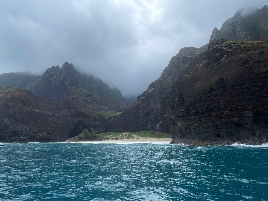 A little after 7am, we were walked to the boat. The rain was consistent but not overly heavy. After boarding, we all sought shelter under a nook tucked away (mostly) from the elements. Despite the rain, the ocean conditions weren’t bad. The waves were fine and we were able to journey towards the Nā Pali coast. It would take over an hour to get there.