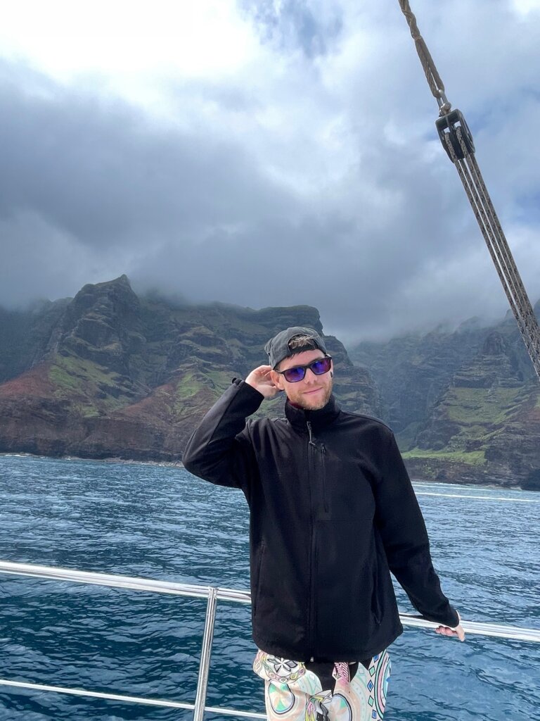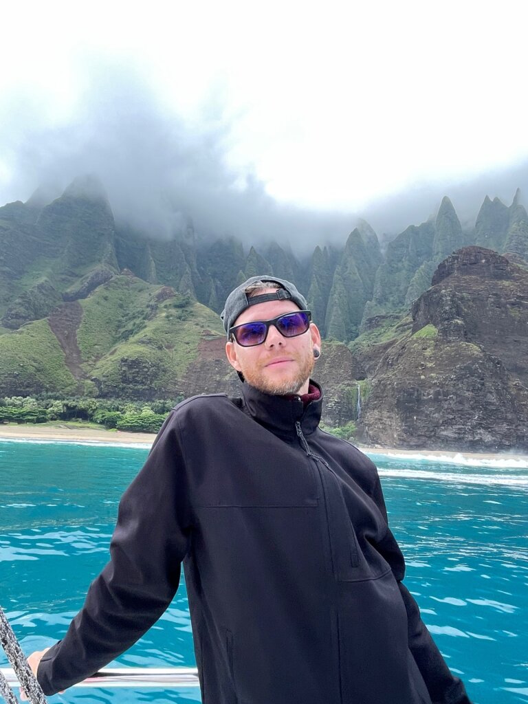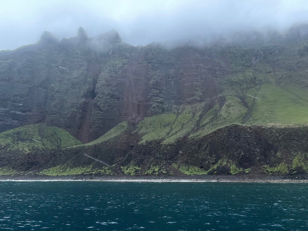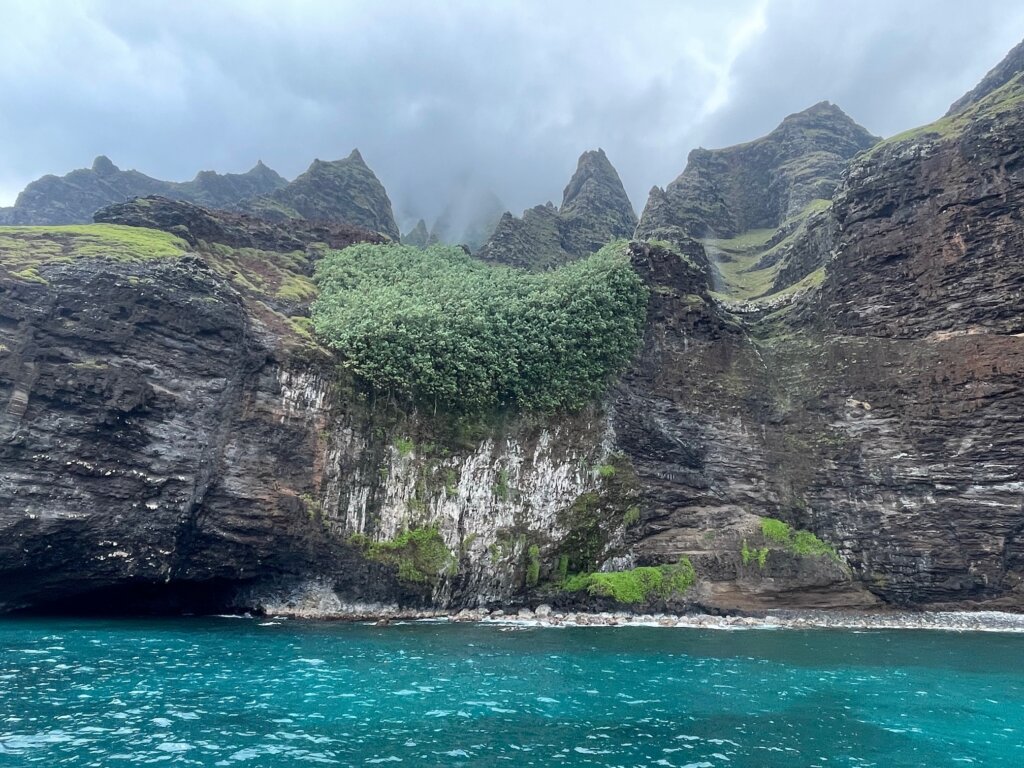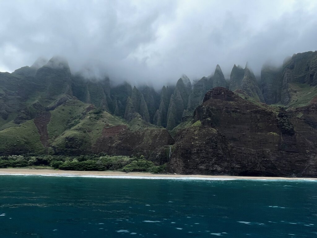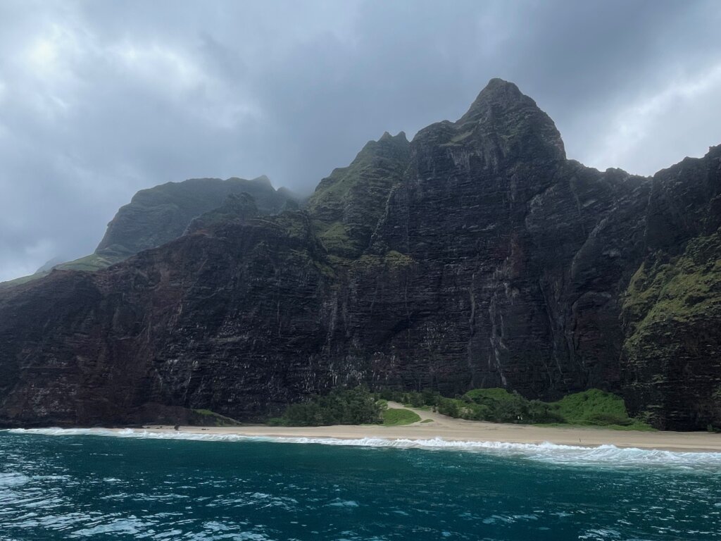 A little after 7am, we were walked to the boat. The rain was consistent but not overly heavy. After boarding, we all sought shelter under a nook tucked away (mostly) from the elements. Despite the rain, the ocean conditions weren’t bad. The waves were fine and we were able to journey towards the Nā Pali coast. It would take over an hour to get there.