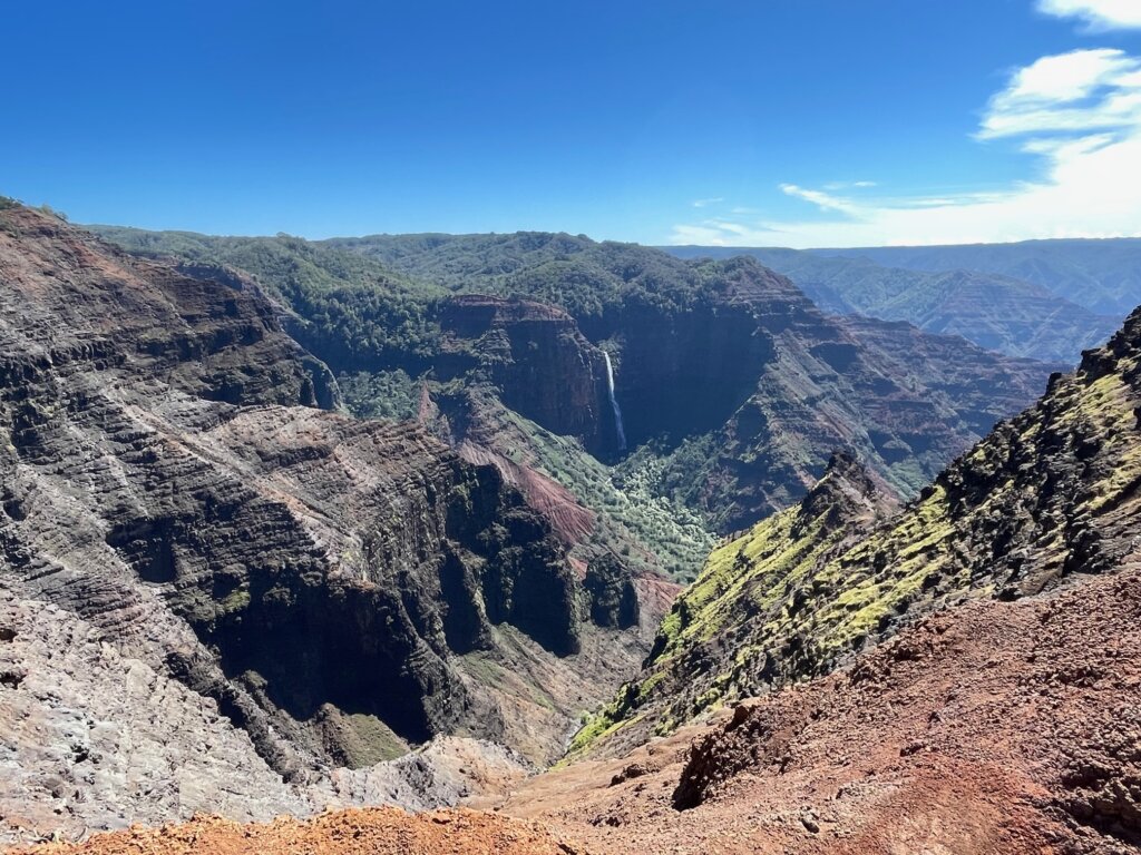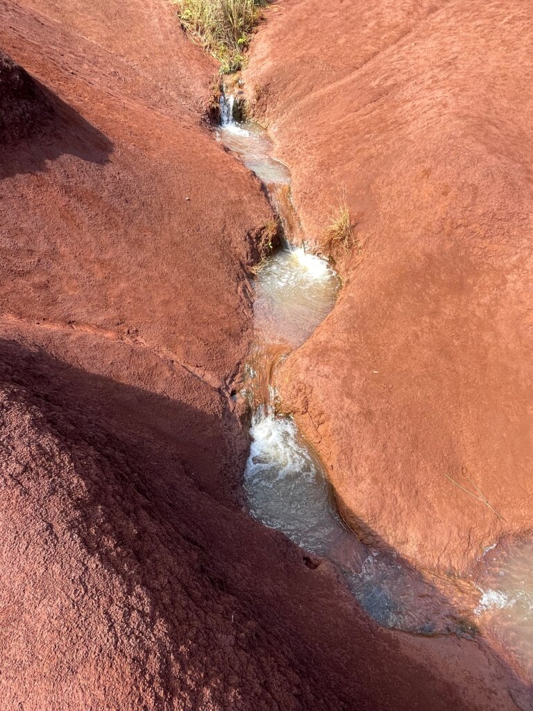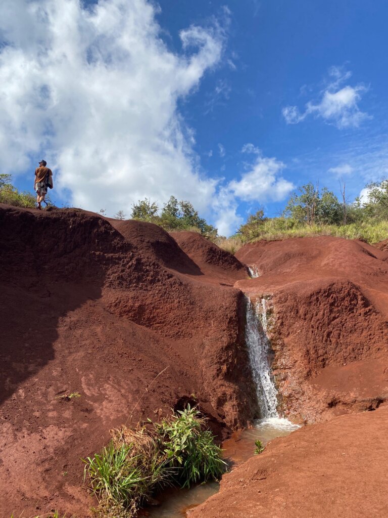I pulled over at a lookout point, our first glimpse of the Waimea Canyon. Nerea and I got out to have a look. Our next stop was a small waterfall the trickled over red dirt – pretty unusual. It looked like something you might expect to see in Arizona, not Kaua’i. We followed the waterfall uphill for some time, but it seemed to go on forever. Eventually we gave up and returned to the car, continuing on.