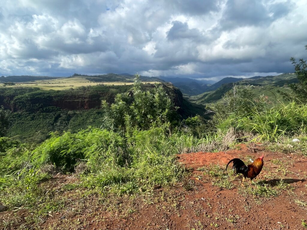 Before sunset, we stopped at Foodland to buy rice and poke. We then drove to a small lookout. We backed up the car, whom we named Destiny, and sat in the trunk, soaking in the view as the light faded. A couple roosters stared at us while we ate our food.