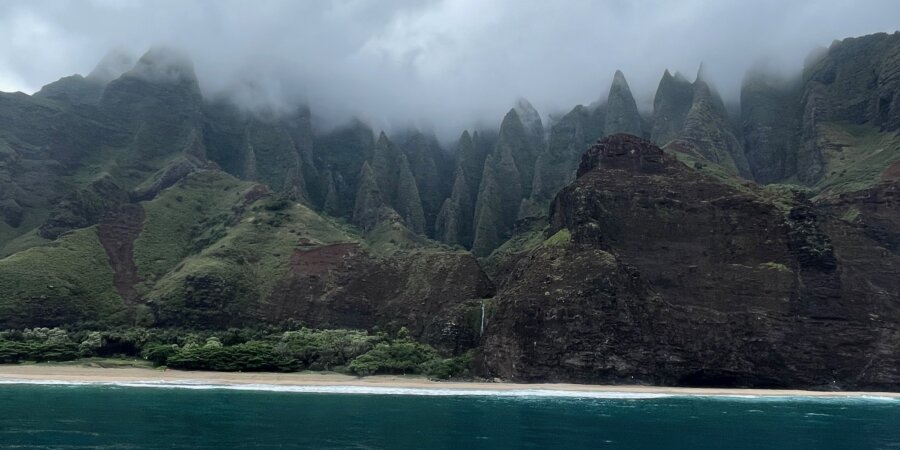 A little after 7am, we were walked to the boat. The rain was consistent but not overly heavy. After boarding, we all sought shelter under a nook tucked away (mostly) from the elements. Despite the rain, the ocean conditions weren’t bad. The waves were fine and we were able to journey towards the Nā Pali coast. It would take over an hour to get there.