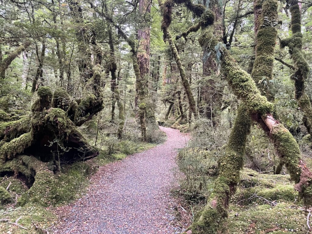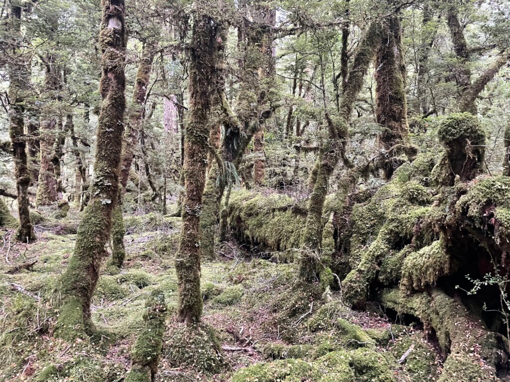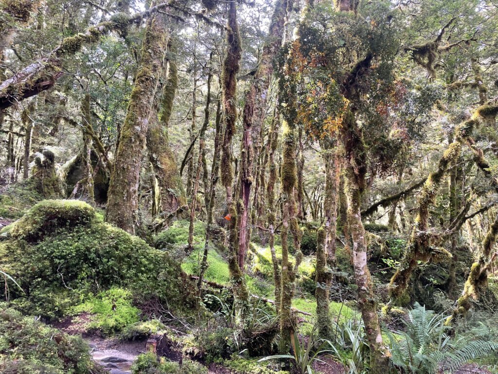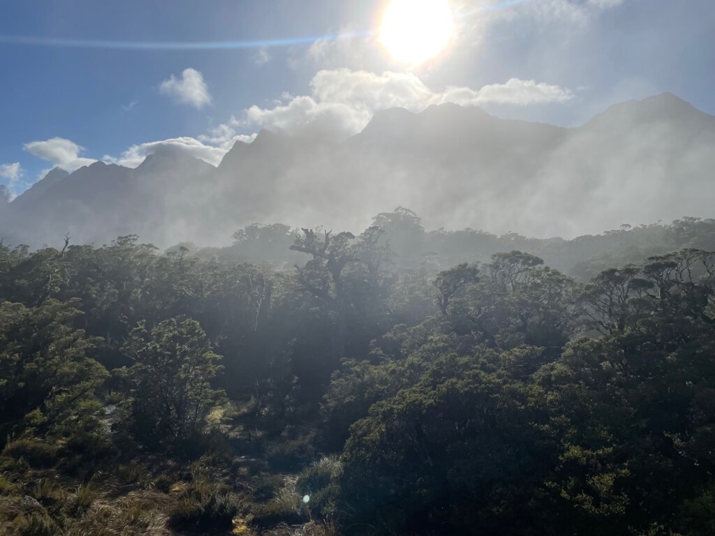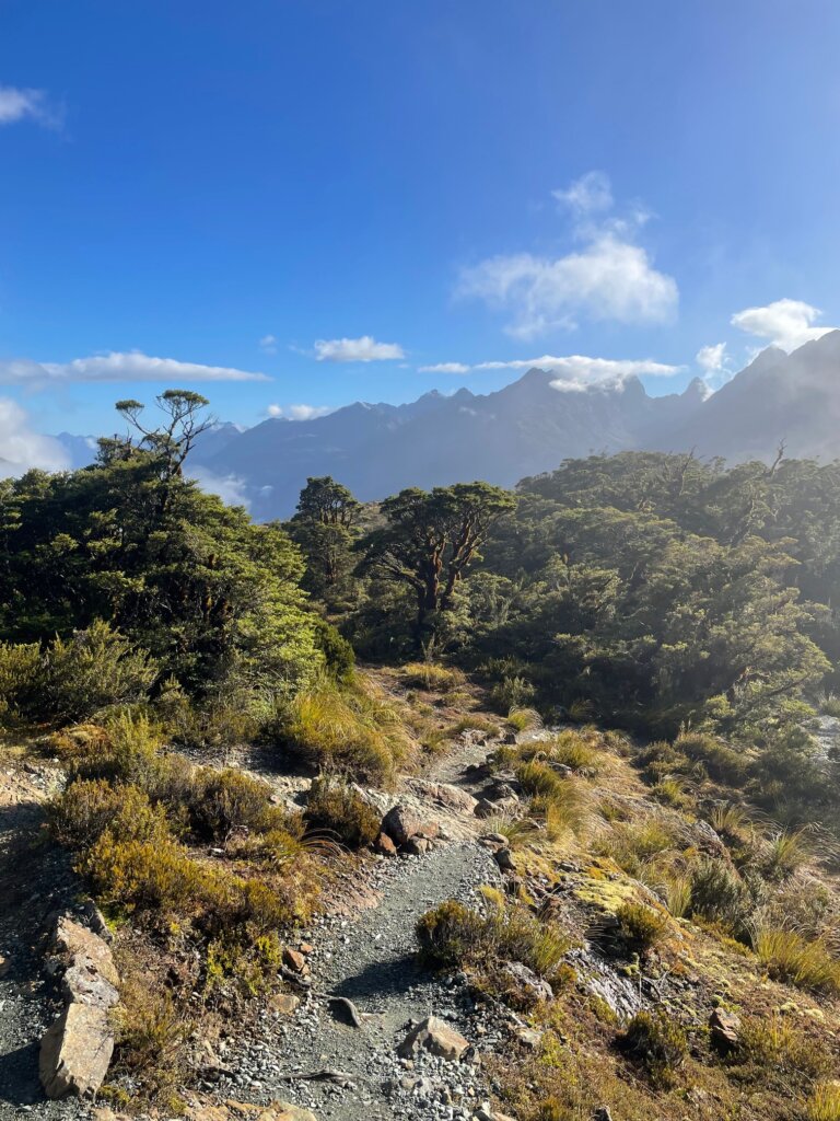 Eventually, I plateaued and was almost out of the woods. I could see bits of mountain finally peaking through in the distance. Before I got to Lake Marian, I spotted a little South Island robin (at least, I think this is what it is after using Google Lens). It was sort of my reward for successfully completing the hike. I love how birds seem to present themselves to me at/near the end of my hikes. There was a lone bird greeting me at the top of Ben Lomond summit, too, if you’ll remember!