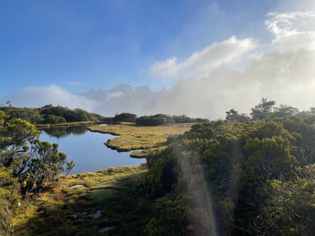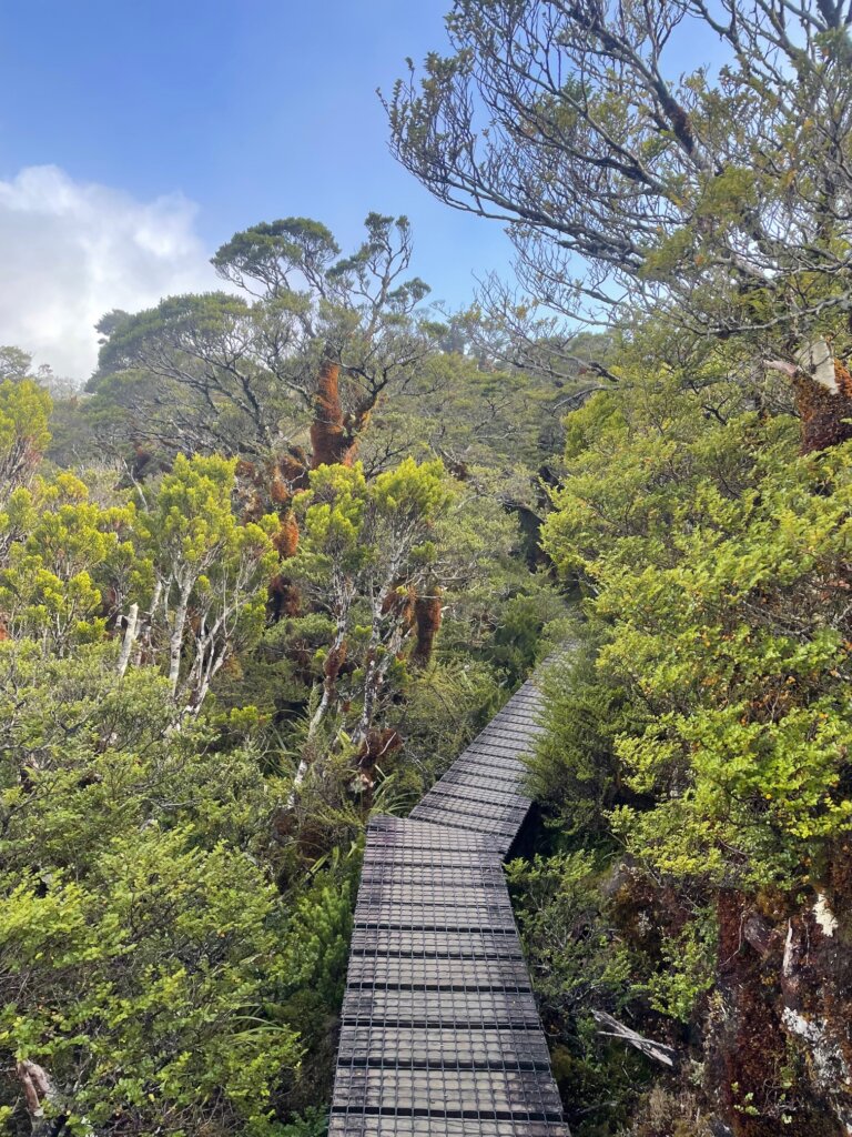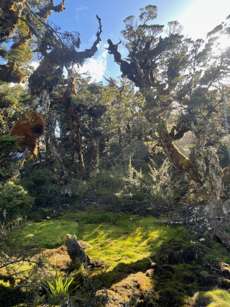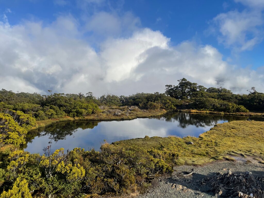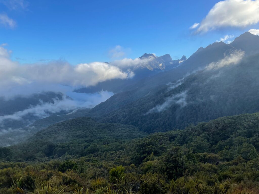 Eventually, I plateaued and was almost out of the woods. I could see bits of mountain finally peaking through in the distance. Before I got to Lake Marian, I spotted a little South Island robin (at least, I think this is what it is after using Google Lens). It was sort of my reward for successfully completing the hike. I love how birds seem to present themselves to me at/near the end of my hikes. There was a lone bird greeting me at the top of Ben Lomond summit, too, if you’ll remember!
