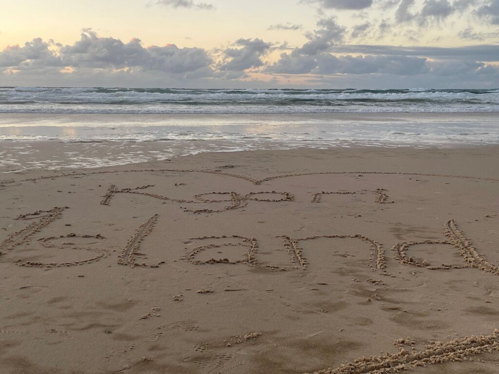 We had a dingo stick with us – not to hit the dingoes with, but to smack them on the ground if a dingo starts approaching, to scare them off. With one of those sticks, Emily carved “K’gari Island” in the sand with a big love heart around it. Ephemeral grafitti. Everything is ephemeral.