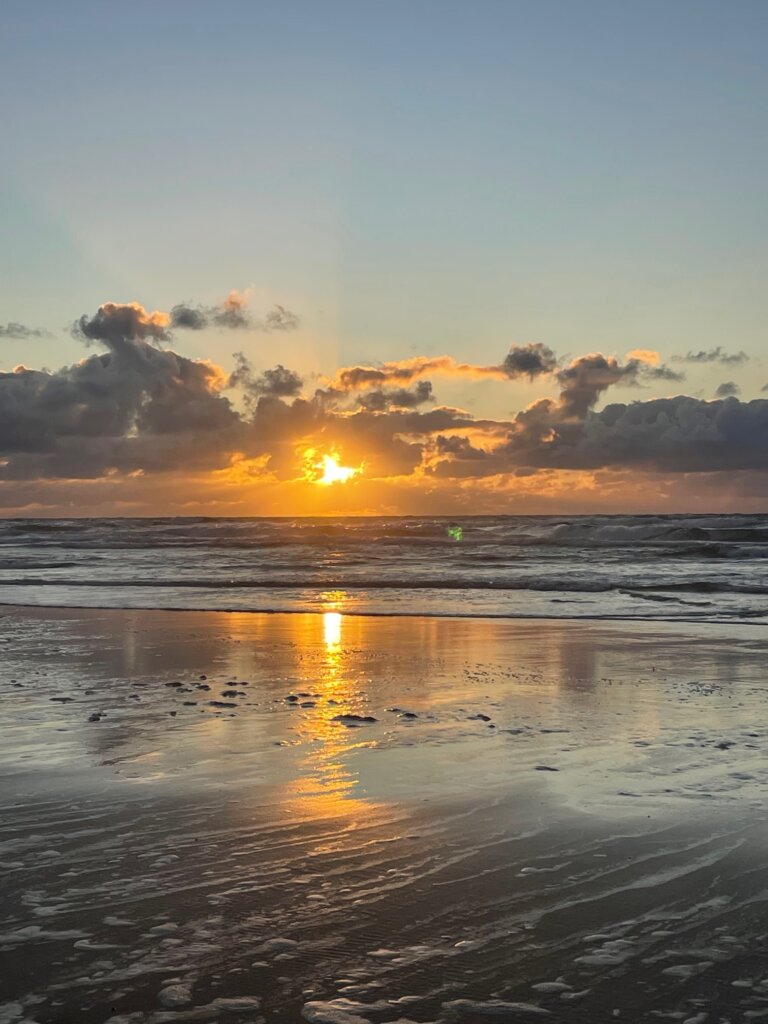 A small group of us met up around 6am and walked down to the beach. The sky was cloudy but as the sun rose, some of the clouds started turning pink.