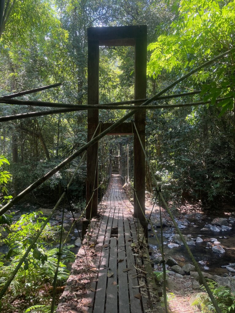We came to a suspension bridge, but noticed there was a sign for a trail leading to a waterfall. Should we go check it out? Yeah! Little did we know, we had actually entered a guided only trail. Whoops! (We didn’t find out until chatting with someone later, who pointed it out.)