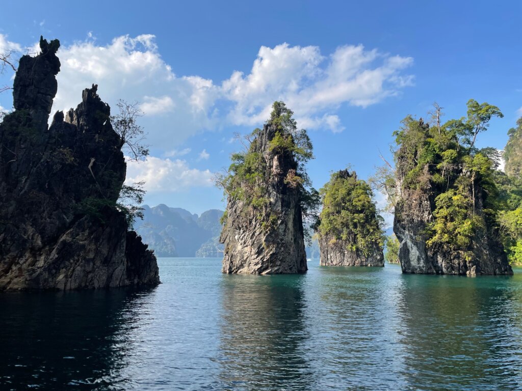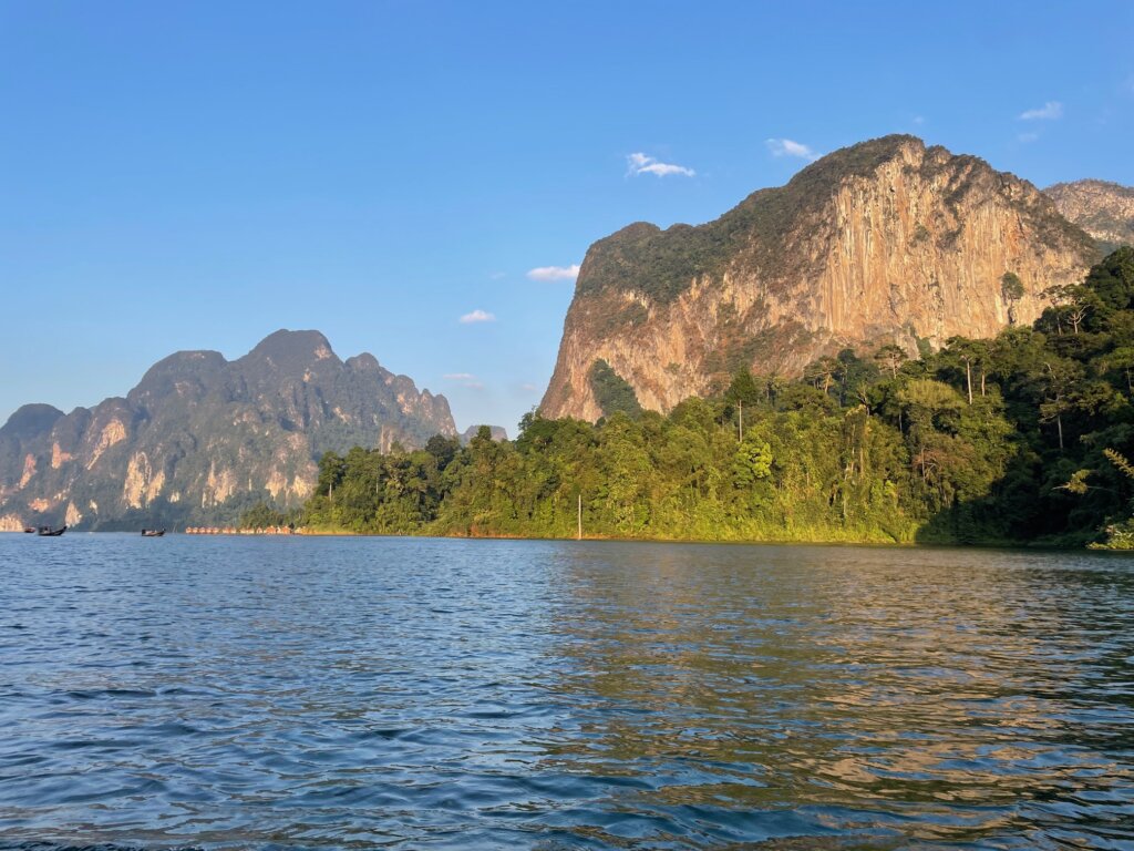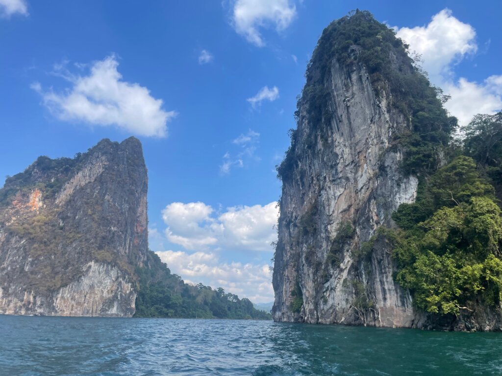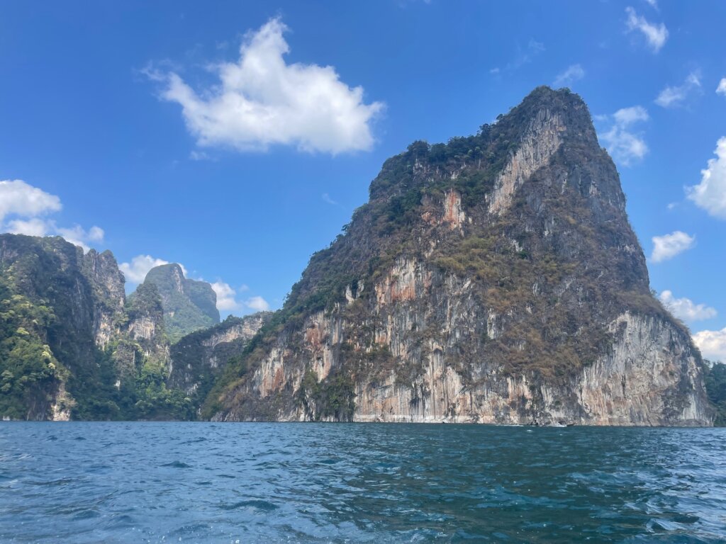 We were given two hours to chill, swim (with mandatory life jackets lol), and sun tan. I did all of the above, reading a book for some time in the sun. Glorious. Once our time was up, we loaded into the longtail boat again and drove towards the “crown jewel” of the lake – Khao Sam Kler or “three friends mountain.” To be honest, I thought the rest of the scenery was far superior to three little karst things.