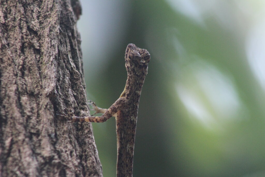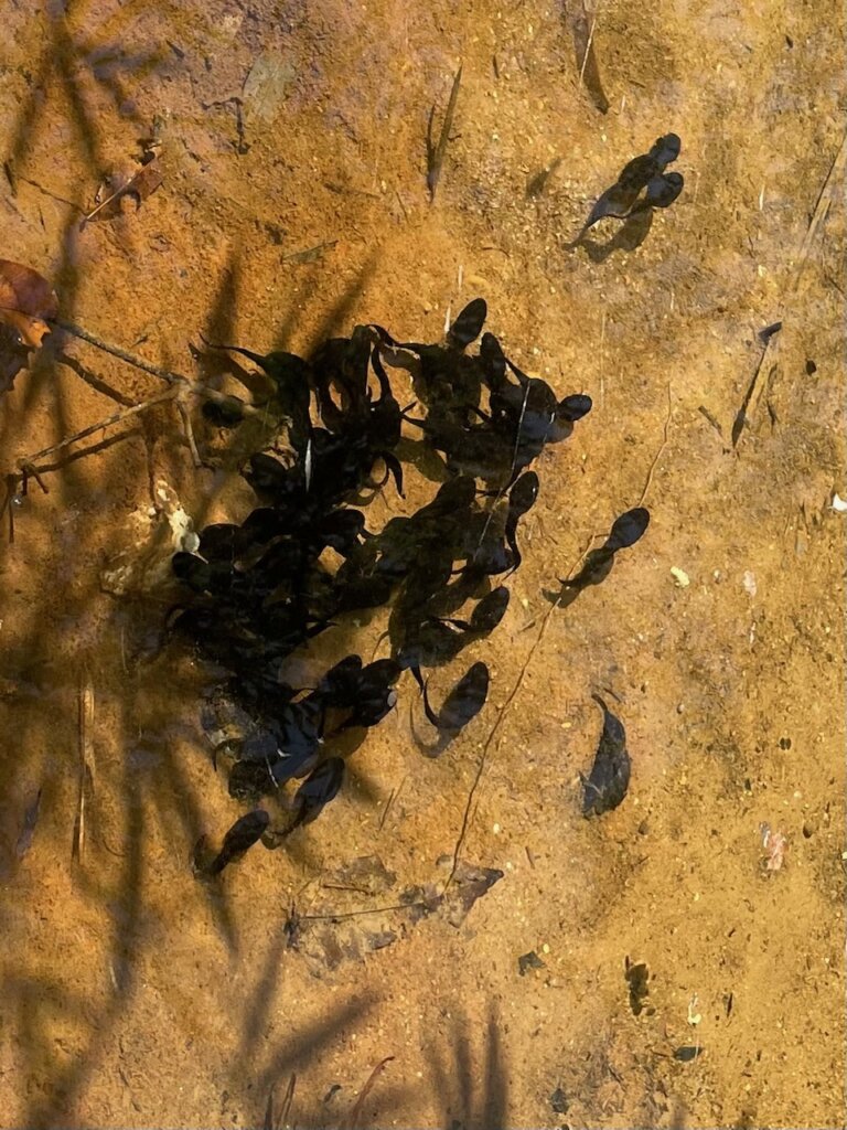I continued my adventure, making my way through all kinds of side trails. I spotted plenty of skinks and small lizards, startled and retreating from their basking spots as I walked past. At another point along the river, a monitor lizard hopped off a tree branch into the water and swam away. I also saw a huge group of tadpoles in the water. Far off, there was a monitor lizard swimming through the water. At first, I thought it was an otter.