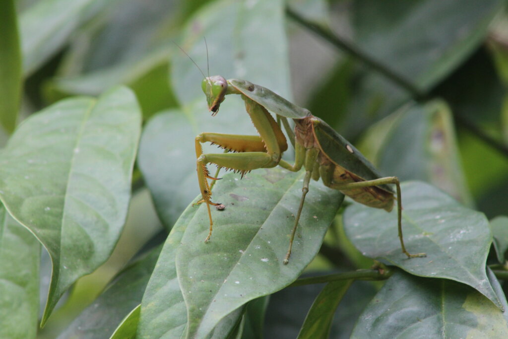 I watched it for a few minutes and then realized it was following my movements. I moved my head to the right, it moved its head to mirror mine. To the left, same thing. I pulled out my phone and started to film the mantis copying my movements, when… PHEW – it flew right at me. It landed on my phone. “JESUS CHRIST!” I called out, and then set my phone down, laughing. I almost got my head ripped off.
