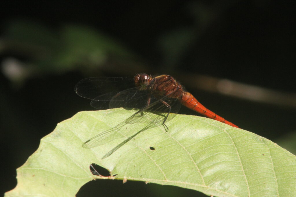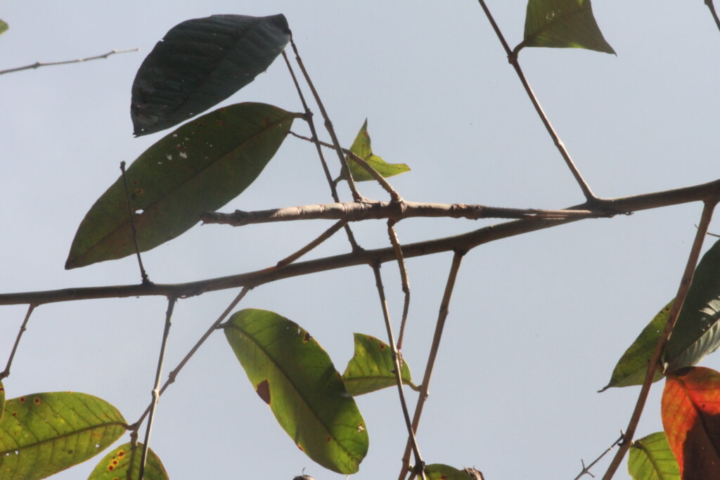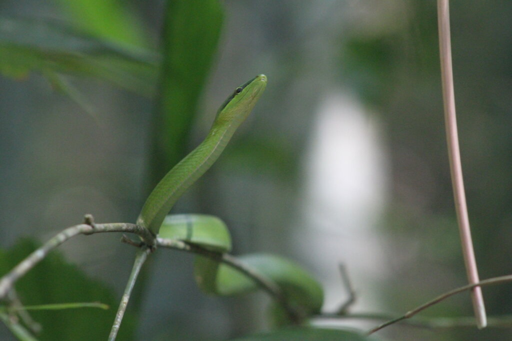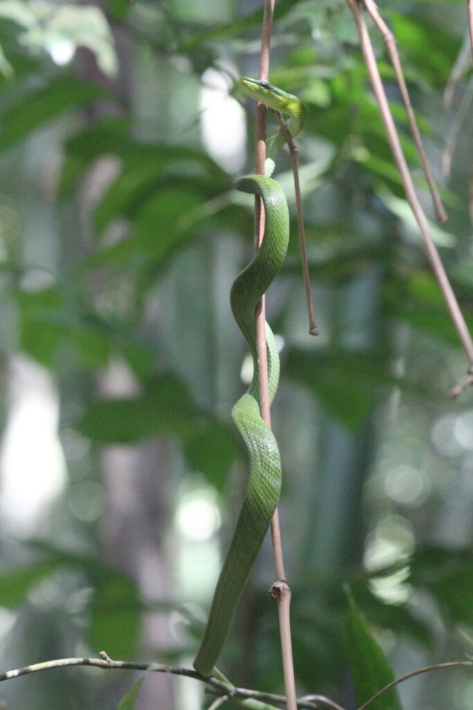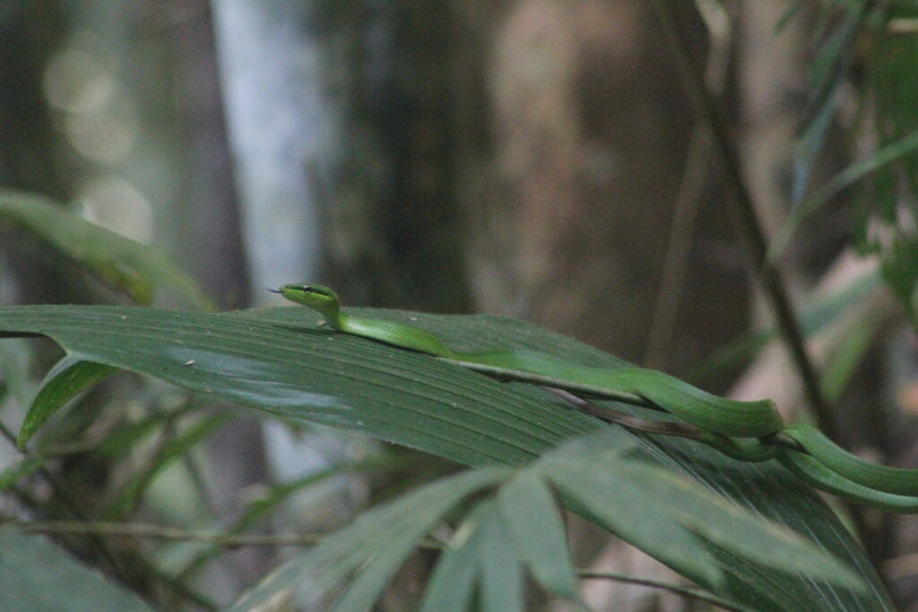 Not two minutes later, another group was staring at a snake resting on a big leaf. WHAT?! This one was a red-tailed green racer, or as the guide called it, “green snake” which is pretty vague haha. I’d once mistaken a bronzeback in Vietnam for a red-tailed green racer, but this was the real deal. It rested on the leaf, motionless and well-camouflaged. As others passed by, they tried to spot it but had a hard time. I tried to help them out. After a few minutes, the green racer started to make slow movements. It reminded me of the vine snake moves – jerking ever so slightly forward as it moves, perhaps trying to mimic a vine gently blowing in the wind.