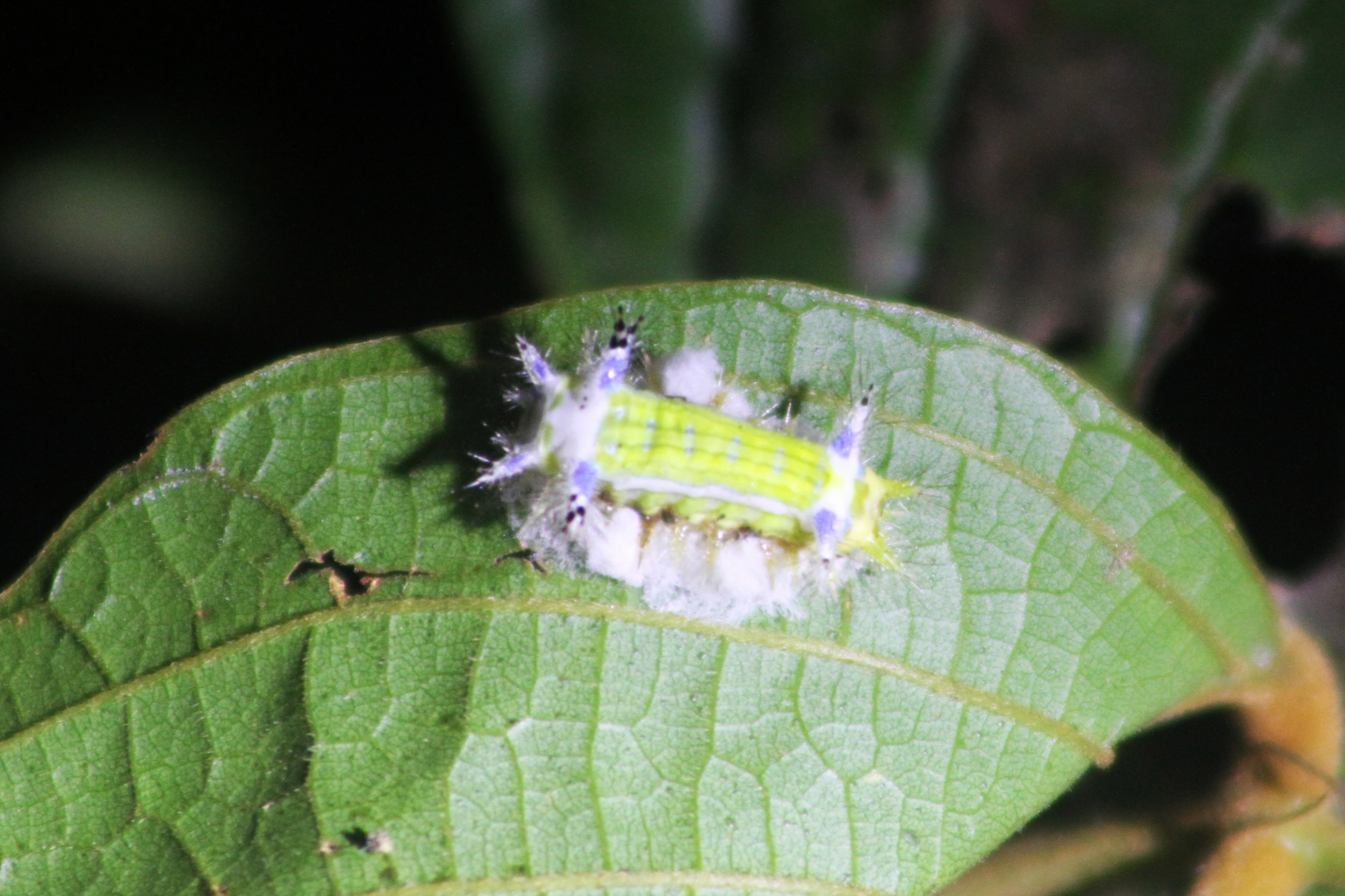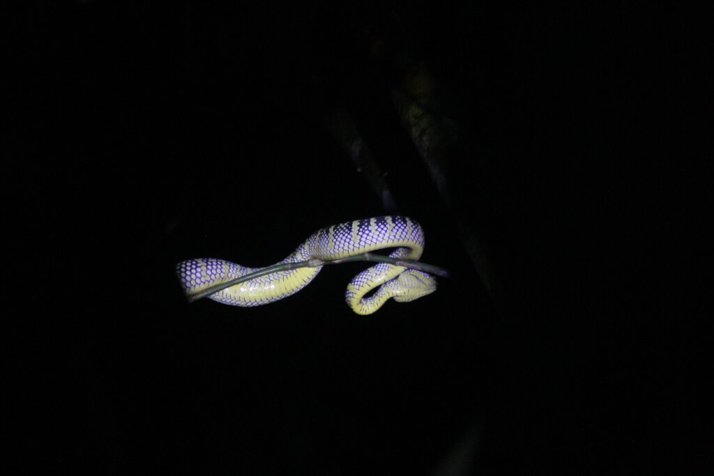 Well, my snake sightings weren’t over that night. Later, we spotted a male (or juvenile) Wagler pit viper high up in a tree. Juveniles start off green with small white polka dots. Males stay the same but females morph into the the black/white/yellow colors.