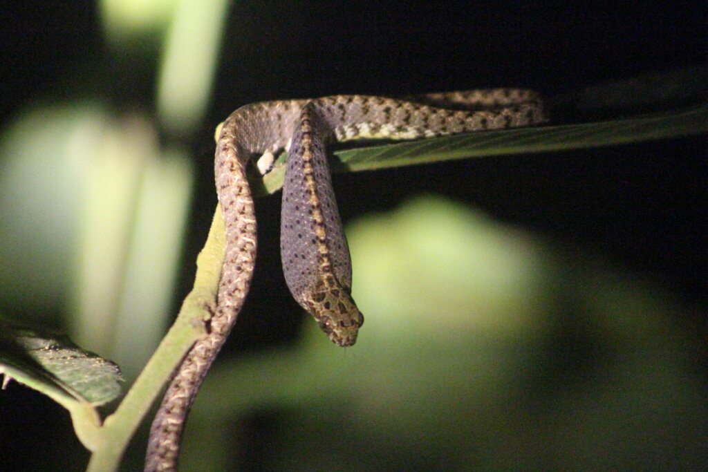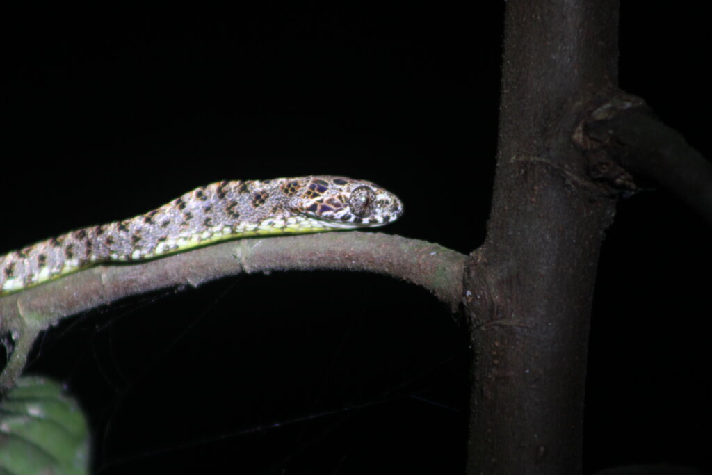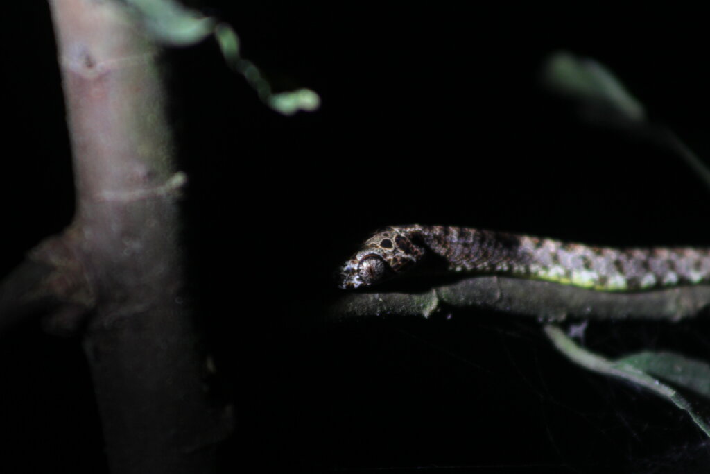 Well, another group had spotted one and it was a delightful sighting. Perched on a small plant just at the edge of the trail was a Jasper cat snake, a species I’d never seen before. And what an absolute beauty it was. I was enamored with its eyes – such a unique pattern! Some kind of marbled design.