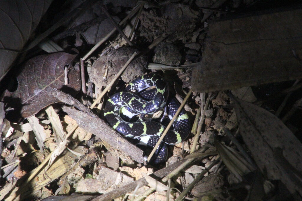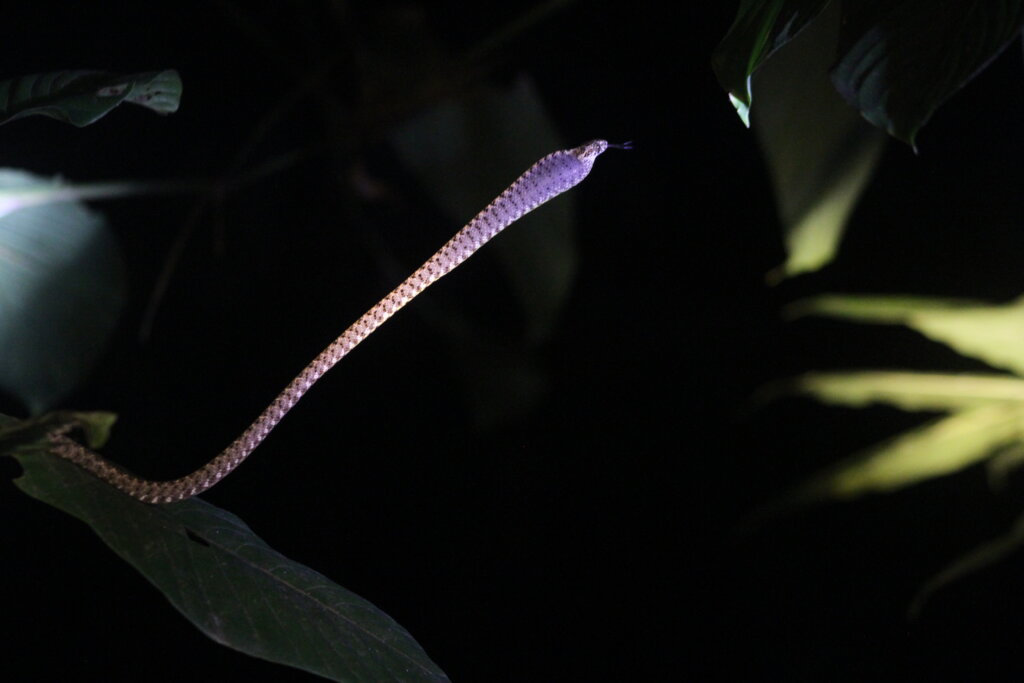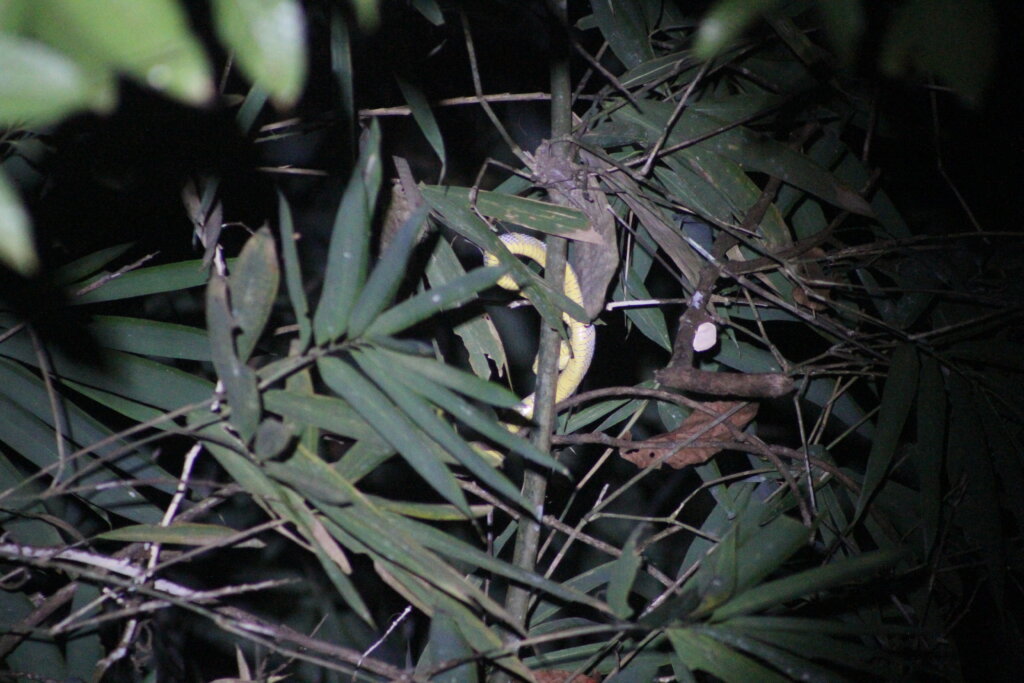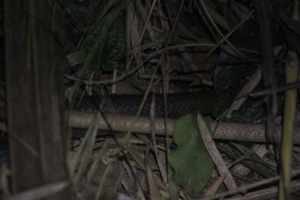However, the highlight of the night and probably my time herping in Khao Sok was when we were walking back to town. Part of me had wanted to wander down another nature trail, but my feet were telling me, “nah. Time to go back.” We were about one minute away from the main street when I turned my headtorch on in time to see a snake slithering away next to a bamboo thicket. And a big snake, it was. Damn it, I thought to myself, I wasn’t able to see its head in time to photograph or identify what it was.